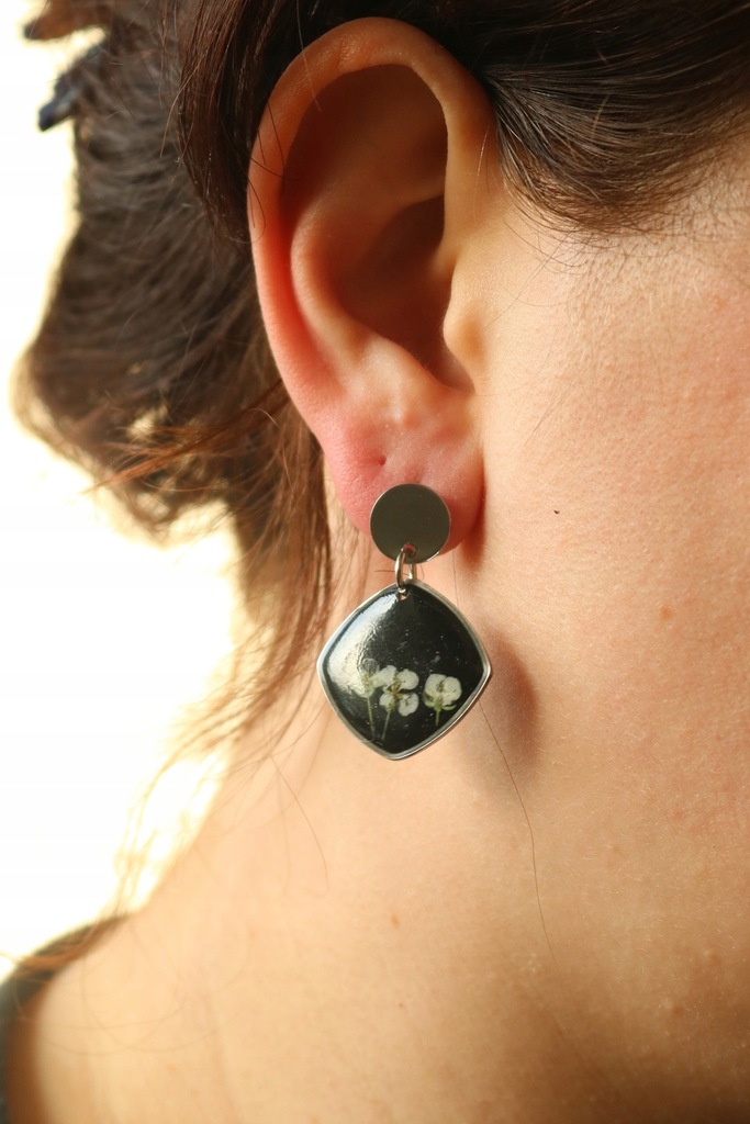 Zostały zawieszone na biglach typu wkręty ze stali w kolorze srebrnym (idealnej dla osób uczulonych na stopy metali, nikiel, a nawet srebro). Całość kolczyka wykonana ze stali.