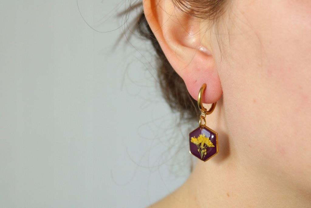 Zostały zawieszone na biglach typu kółeczka ze stali chirurgicznej w kolorze złotym (idealnej dla osób uczulonych na stopy metali, nikiel, a nawet srebro). Całość kolczyka wykonana ze stali chirurgicznej.