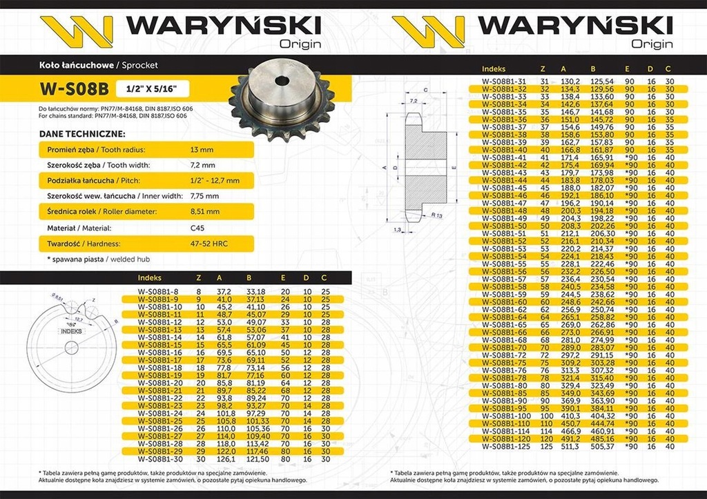 Zwiększona odporność na pękanie. Wszystkie koła wykonane zostały z wysokowęglowej stali. Bardzo dobra współpraca z łańcuchami Waryński. Dokładne i powtarzalne odległości pomiędzy zębami powodują, że łańcuch idealnie układa się na kole, tym samym nie uszkadzając łańcucha.