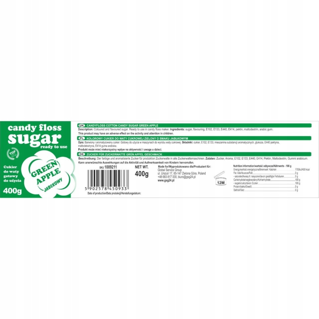 Skład: cukier, E102, E133, mieszanina substancji aromatycznych, glukoza, E440 pektyna, maltodekstryna, E414 guma arabska.Trwałość od otwarcia 2 lata.Candyfloss cotton candy sugar green apple. Coloured and flavoured sugar. Ready to use in candy floss maker.Ingredients: sugar, flavouring, E102, E133, E440, E414, pektin, maltodextrin, arabic gum.Zucker für Zuckerwatte Grün Apfel Geschmack. Der farbige und aromatisierte Zucker für produktion Zuckerwatte in alle Zuckerwattemaschinen.Zutaten: Zucker, Aroma, E102, E133, E440, E414, Pektin, Maltodextrin, Gummi arabicum.W zestawie: