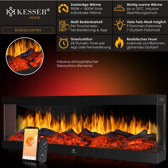 Zmień swój dom w prawdziwy raj komfortu w zimnych porach roku dzięki kominkowi ściennemu KESSER®, który tworzy autentyczną atmosferę kominka. Ten ekskluzywny kominek elektryczny jest nie tylko źródłem ciepła, ale także przyciąga wzrok i przekształca pomieszczenia o powierzchni do 30m² w romantyczny zakątek.