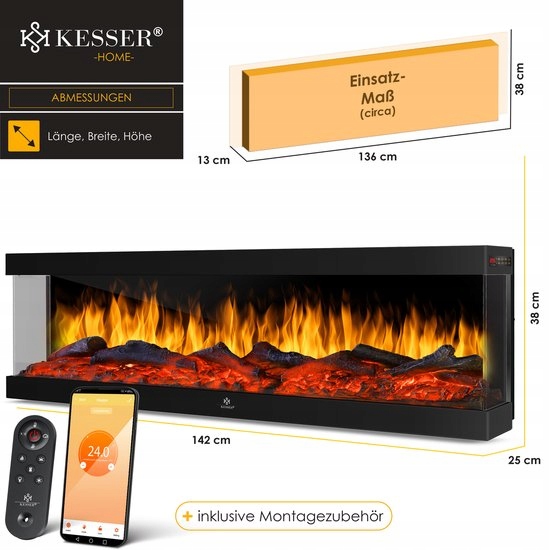 MONTAŻ NA ŚCIANIE OSZCZĘDZAJĄCY MIEJSCE: Kominek Kesser można elegancko wbudować w ścianę, oszczędzając miejsce i zapewniając stylową integrację z domem. Instalacja jest łatwa i bezpieczna dzięki dołączonemu zestawowi montażowemu.