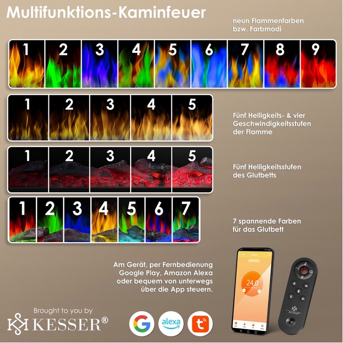 INTELIGENTNE STEROWANIE: Intuicyjna obsługa zgodnie z Twoimi życzeniami. Użyj łatwego w obsłudze ekranu dotykowego, dołączonego pilota lub poręcznej aplikacji (w tym obsługa Google Play i Amazon Alexa), aby uzyskać pełną kontrolę. Dzięki 24-godzinnemu timerowi możesz dostosować kominek do swojego codziennego harmonogramu.