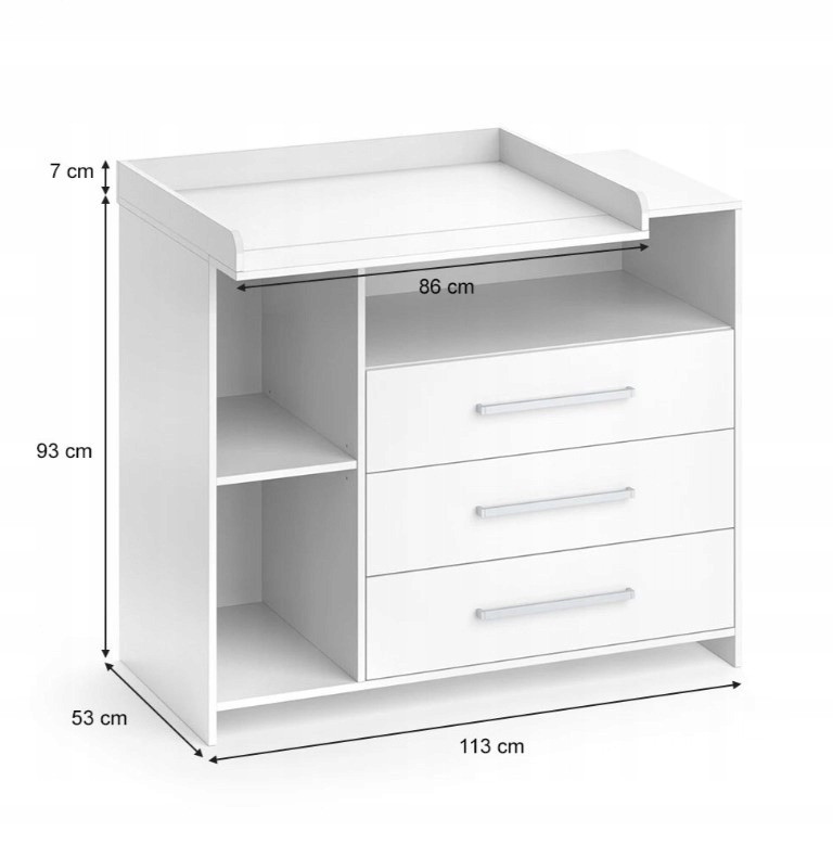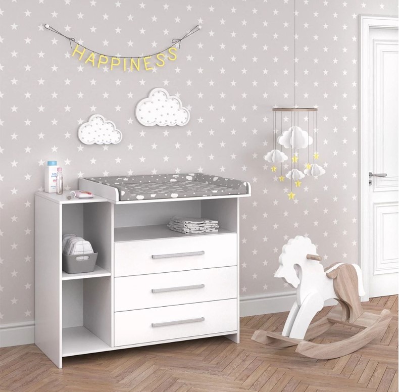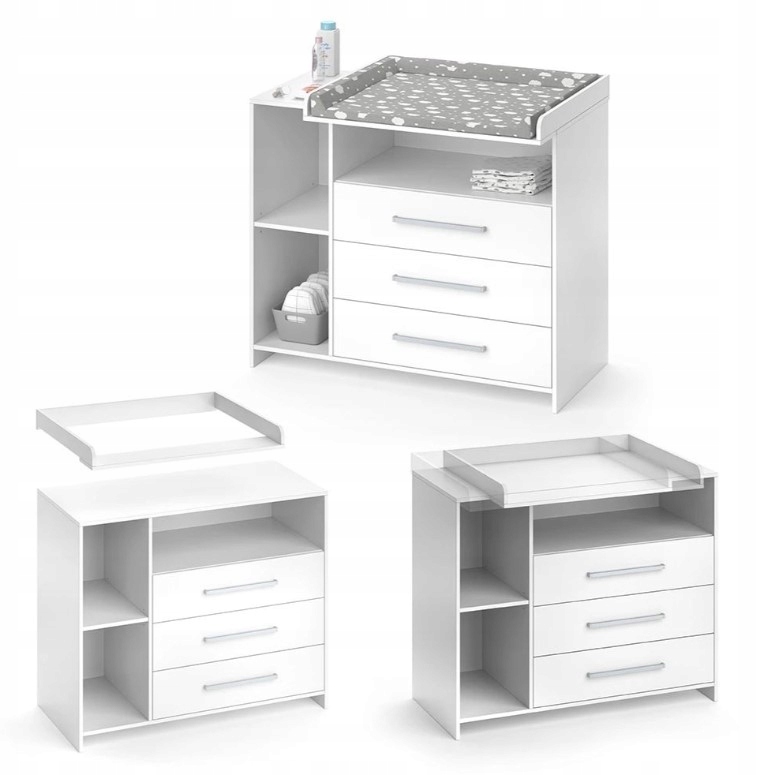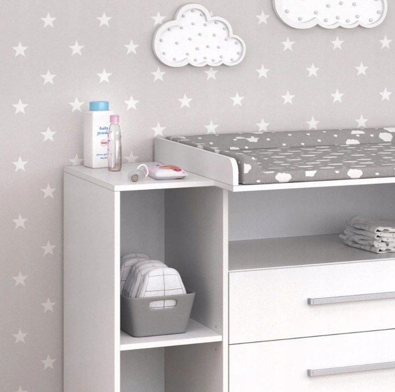 ➡️Trzy pojemne szuflady oraz otwarte półki umożliwiają przechowywanie wszystkich niezbędnych akcesoriów, ubranek i pieluszek w zasięgu ręki.