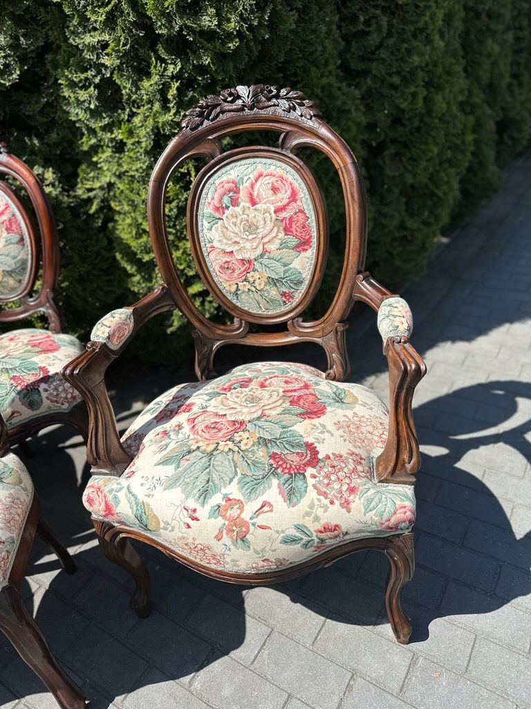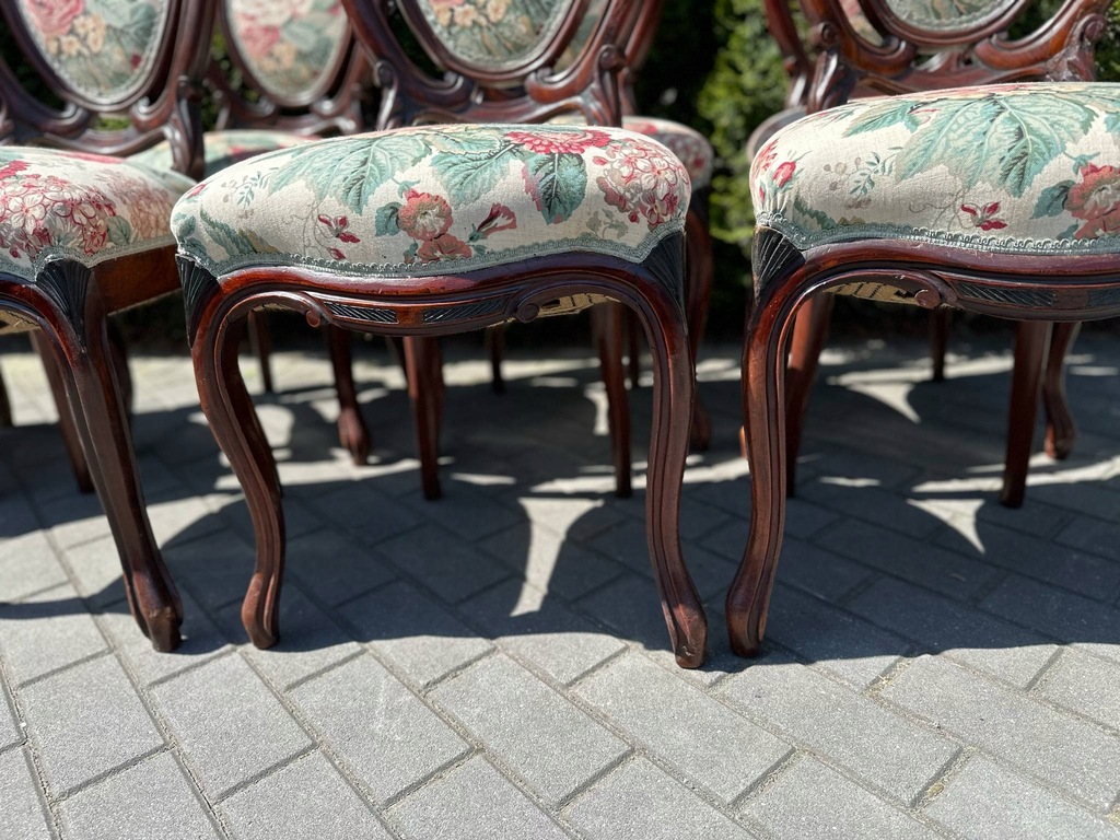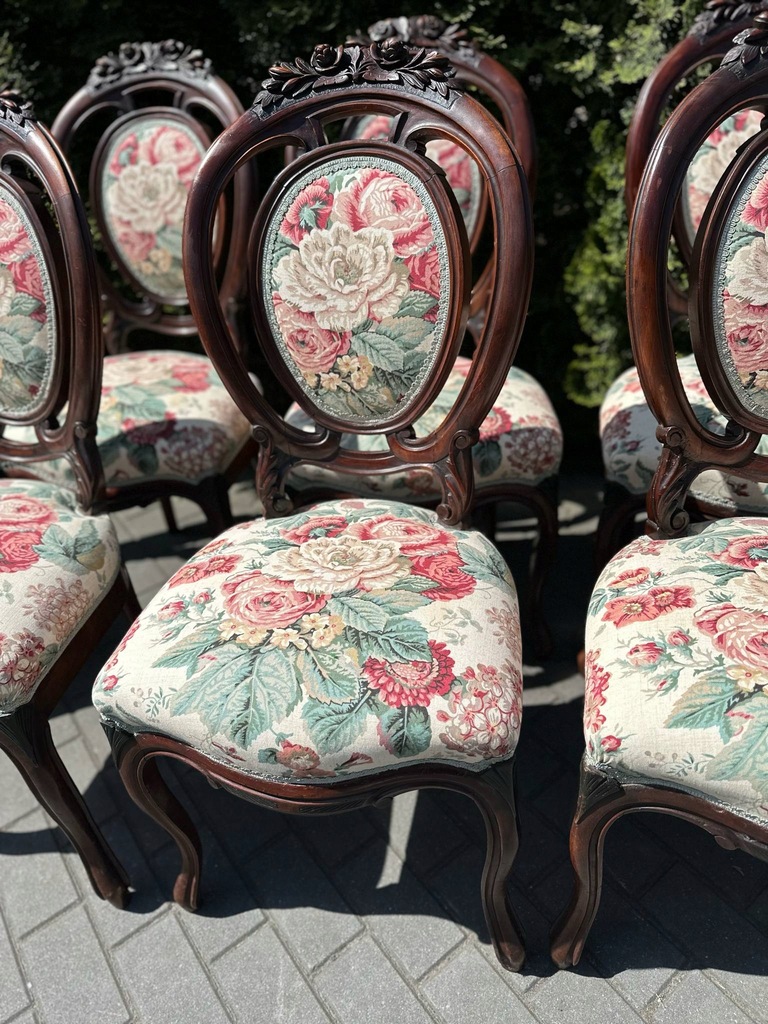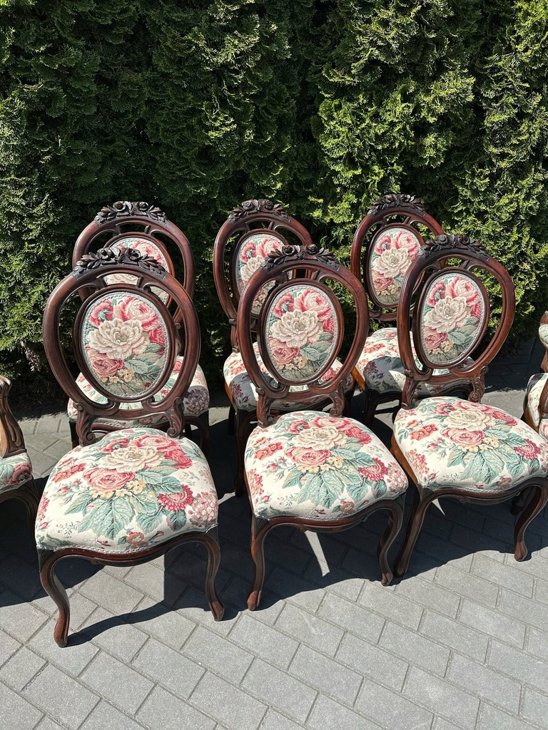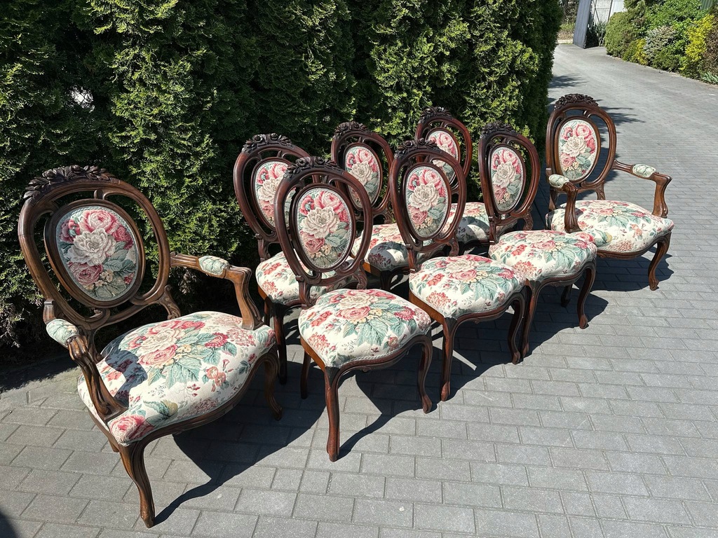 Wyjątkowy komplet 8 eleganckich krzeseł, w tym 2 z podłokietnikami, wykonanych w klasycznym stylu Ludwikowskim.