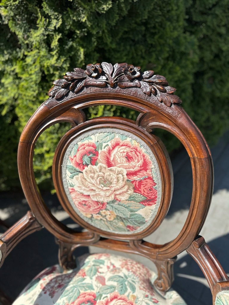 Solidne drewno, ręcznie rzeźbione detale. Tapicerka wysokiej jakości gobelin z motywem kwiatowym (róże i liście).
