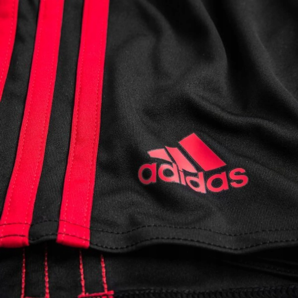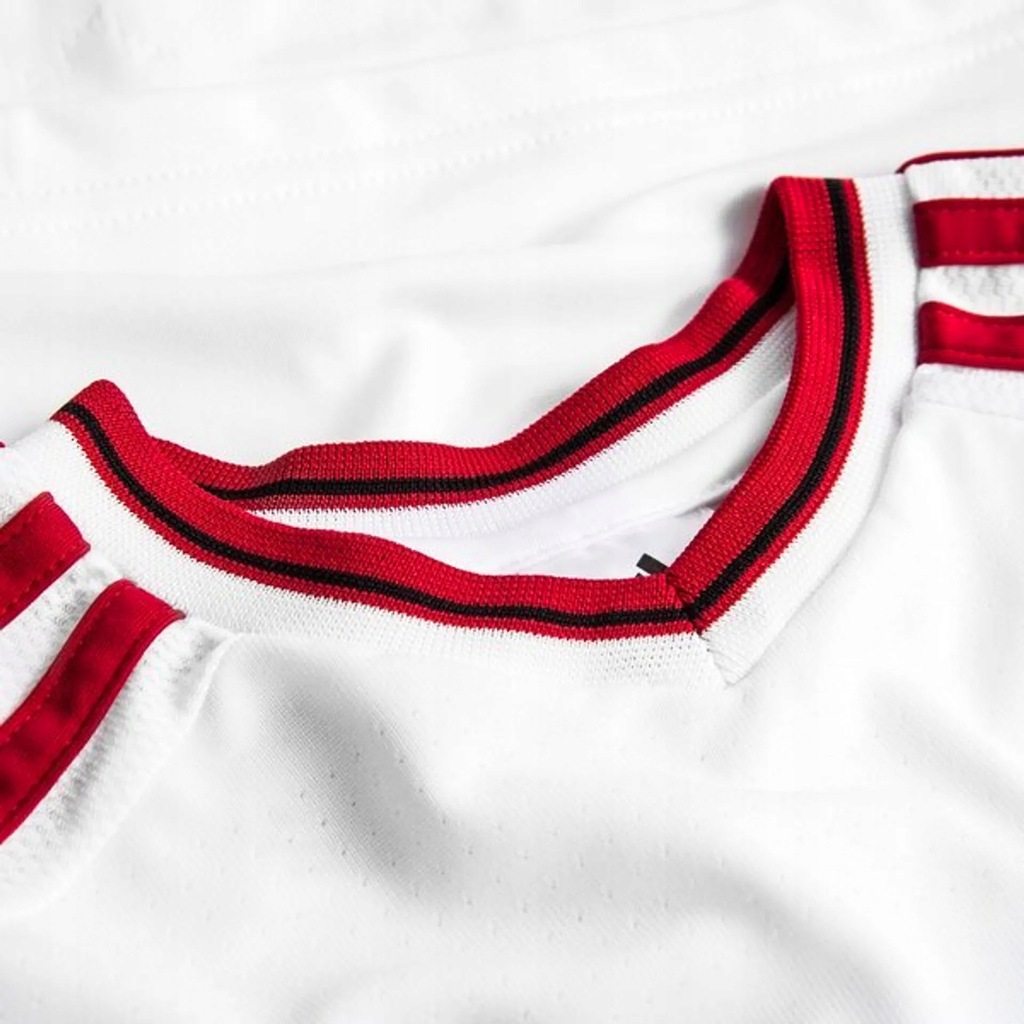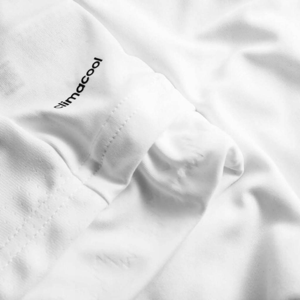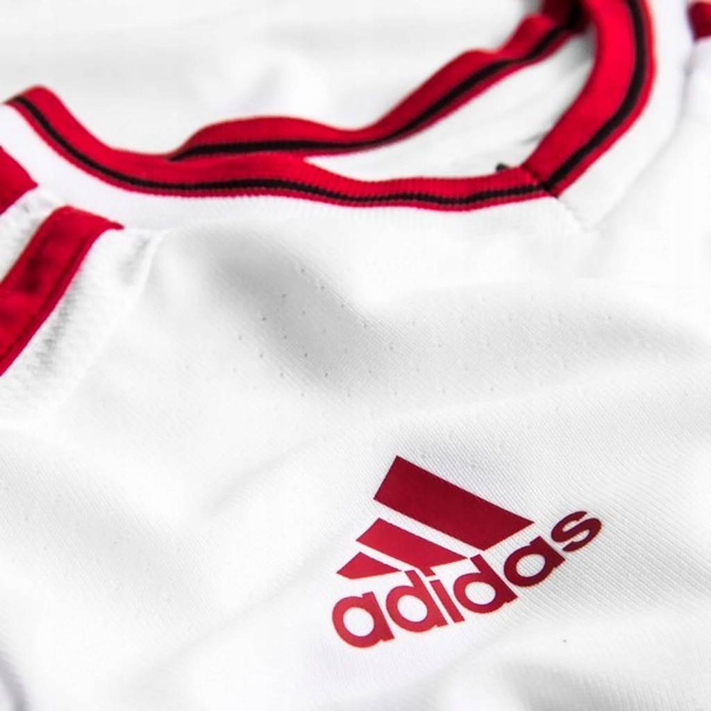 Białe paski adidas na ramionach. Reklama wydrukowana z przodu