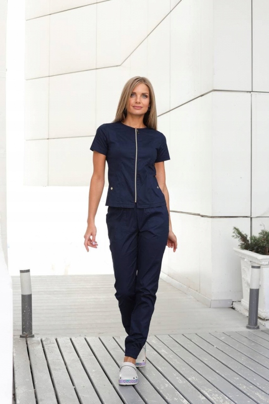 Komplet medyczny damski z kolekcji IN WHITE Special to idealne rozwiązanie dla każdej kobiety pracującej w branży medycznej, która ceni sobie nie tylko funkcjonalność, ale także modny wygląd. Kurtka skrócona z centralnym zapięciem na złotą suwak prezentuje się bardzo elegancko, a półprzylegający krój dodaje jej kobiecego charakteru. Rękaw krótki sprawia, że jest to idealna opcja na cieplejsze dni.
