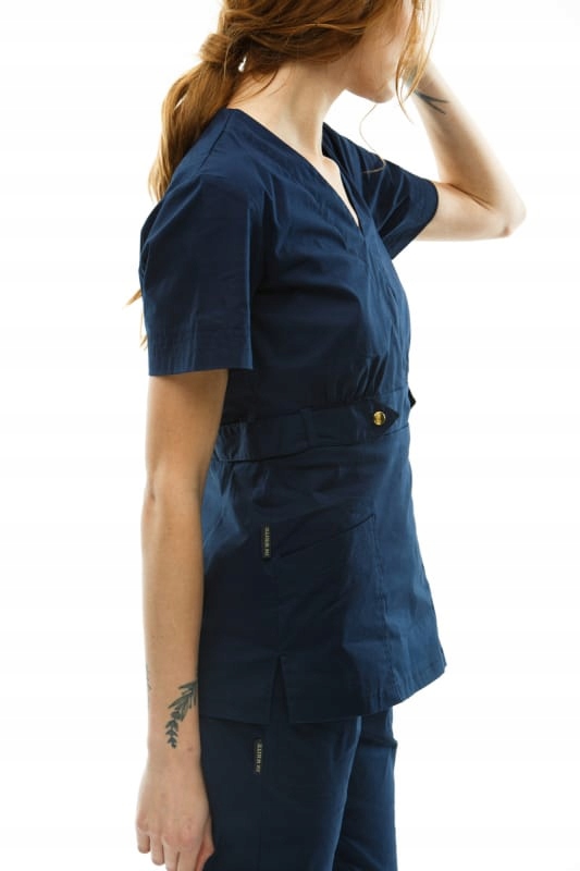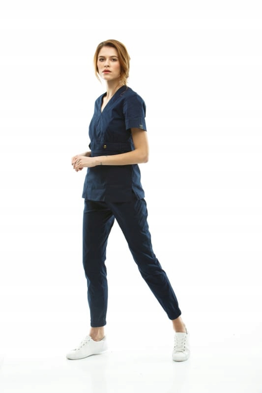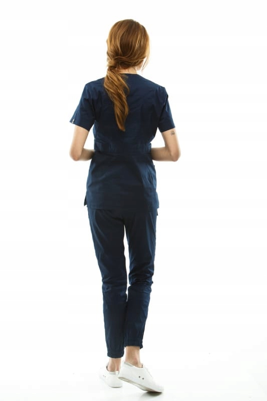 Damski komplet medyczny. Kurtka z krótkim rękawem zapinana na złoty zamek. Okrągły dekolt. Spodnie slim fit ze ściągaczami na dole nogawek.