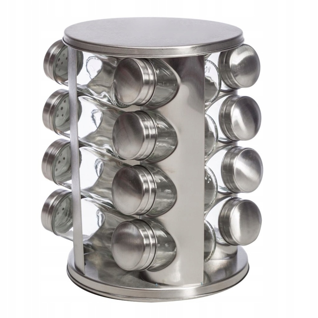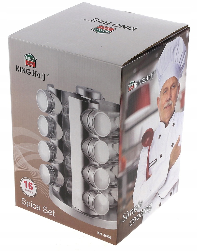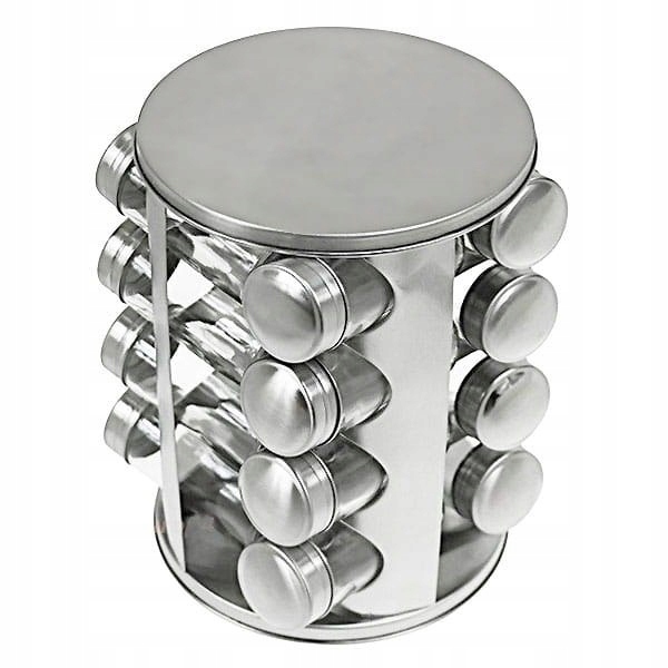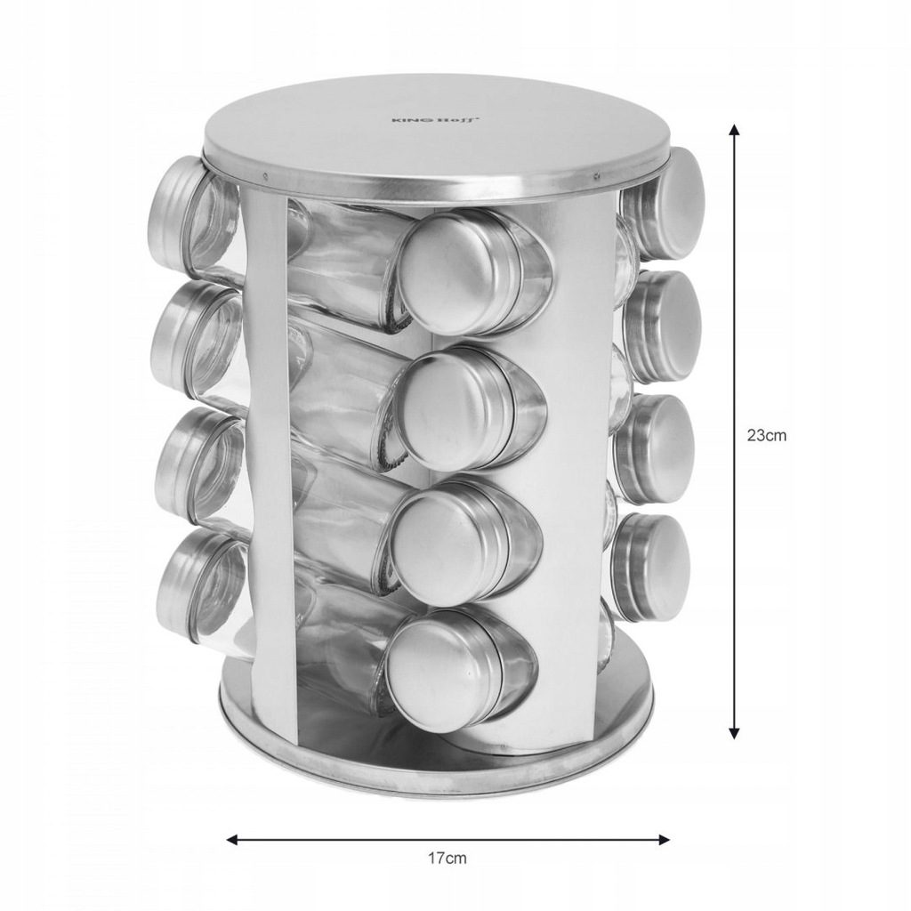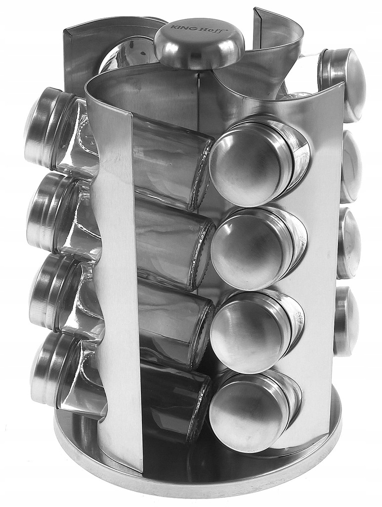 Zestaw 16 pojemników szklanych na obrotowym stojaku KINGHOFF wykonany ze stali nierdzewnej satynowej (INOX). Pojemniczki wykonane z grubego szkła, zamykane kapslem stalowym. Pod kapslem znajduje się zatyczka z dziurkami służąca do posypywania. Stojak obraca się na obrotowej podstawie wokół własnej osi 360 st.