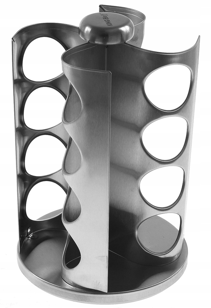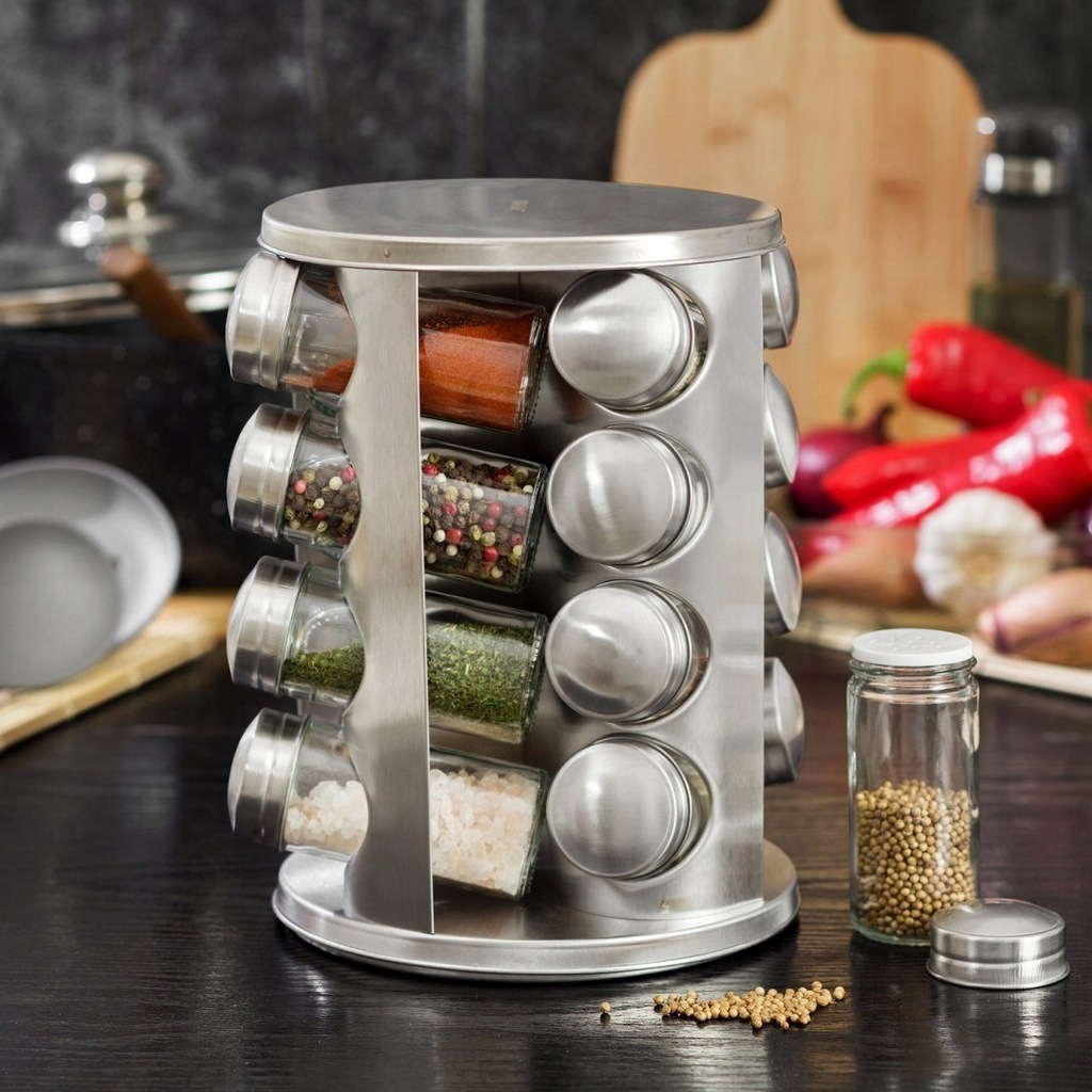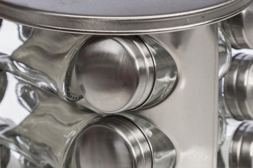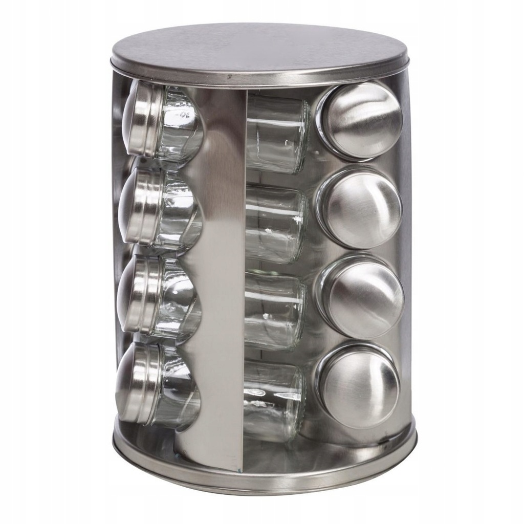 Zestaw 16 pojemników szklanych na obrotowym stojaku KINGHOFF wykonany ze stali nierdzewnej satynowej (INOX). Pojemniczki wykonane z grubego szkła, zamykane kapslem stalowym. Pod kapslem znajduje się zatyczka z dziurkami służąca do posypywania. Stojak obraca się na obrotowej podstawie wokół własnej osi 360 st.