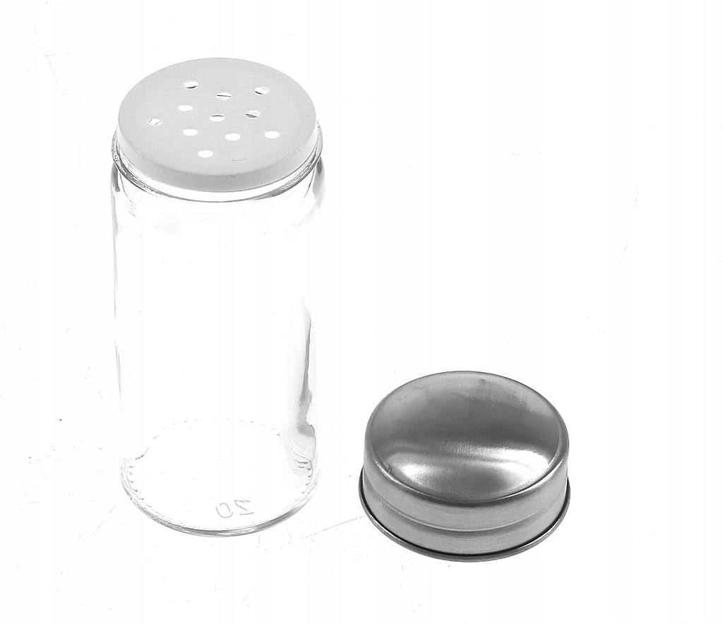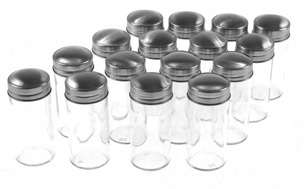 W zestawie 16 pojemników szklanych z nakrętką metalową i stojak.