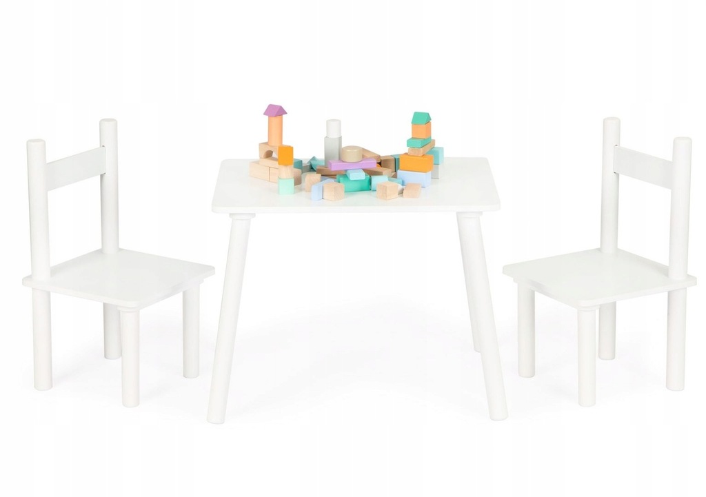 Wspaniały zestaw dla wszystkich maluchów, dzięki swojej prostej formie idealnie wpasuje się w wystrój dziecięcych pokoików, sal zabaw, czy poczekalni. Stół posiada solidne sosnowe nogi nadające mu stabilności, blat wykonany jest z MDF-u co sprawia, że jest łatwy w utrzymaniu i odporny na uszkodzenia/zarysowania. Uzupełnieniem zestawu są dwa stabilne i wygodne krzesełka.