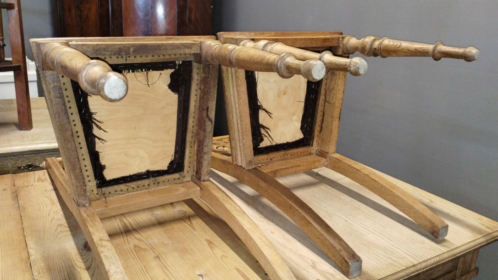 Zestaw krzeseł eklektycznych stan dobry do renowacji,dwa krzesła mają troszkę inną formę, dopiero przy wnikliwych oględzinach jest to zauważalne,pierwotnie miały wyplatane siedziska z rafii, ktoś zastąpił to materiałem ze sklejką.