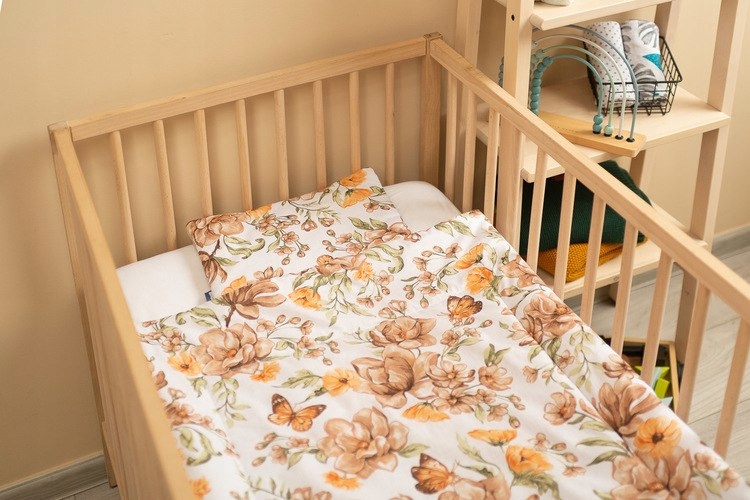 Komplet do łóżeczka jest wykonany z jednej strony z wysokiej jakości kolorowej bawełny, a z drugiej przyjemnego w dotyku velvetu. Składa się z płaskiej poduszki oraz kołderki z antyalergicznym wypełnieniem. Milutka tkanina przyjemnie otuli każdego maluszka.