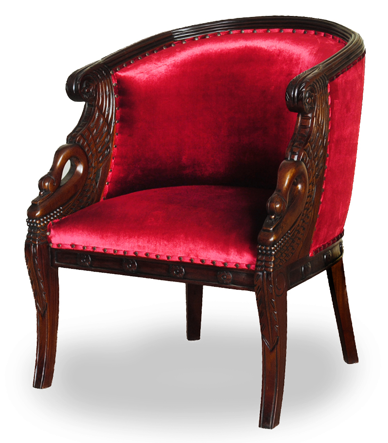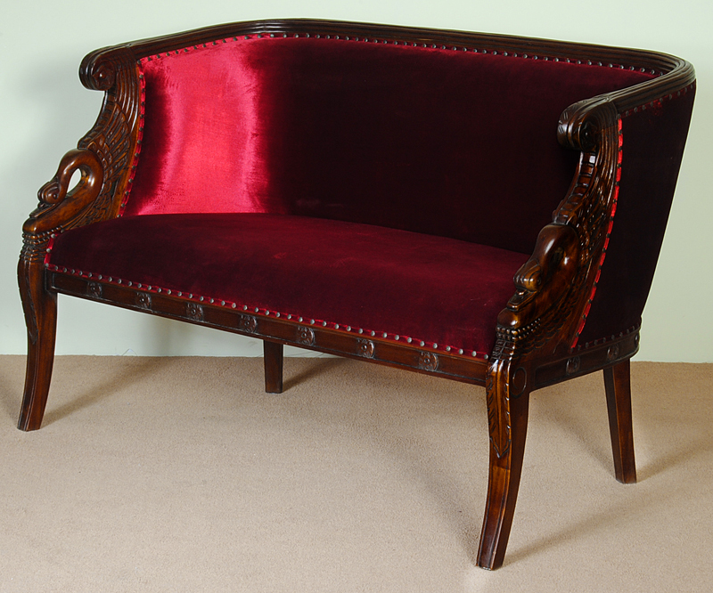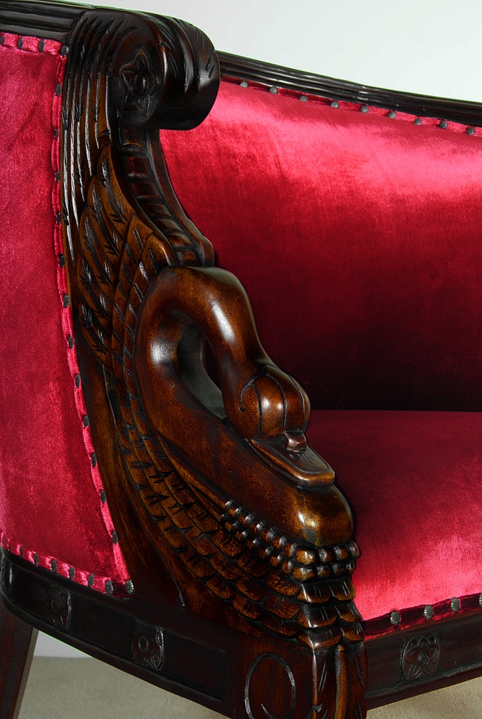 Przedmiotem sprzedaży jest komplet wypoczynkowy (sofa + 2 fotele) w stylu empire z motywem łabędzia.