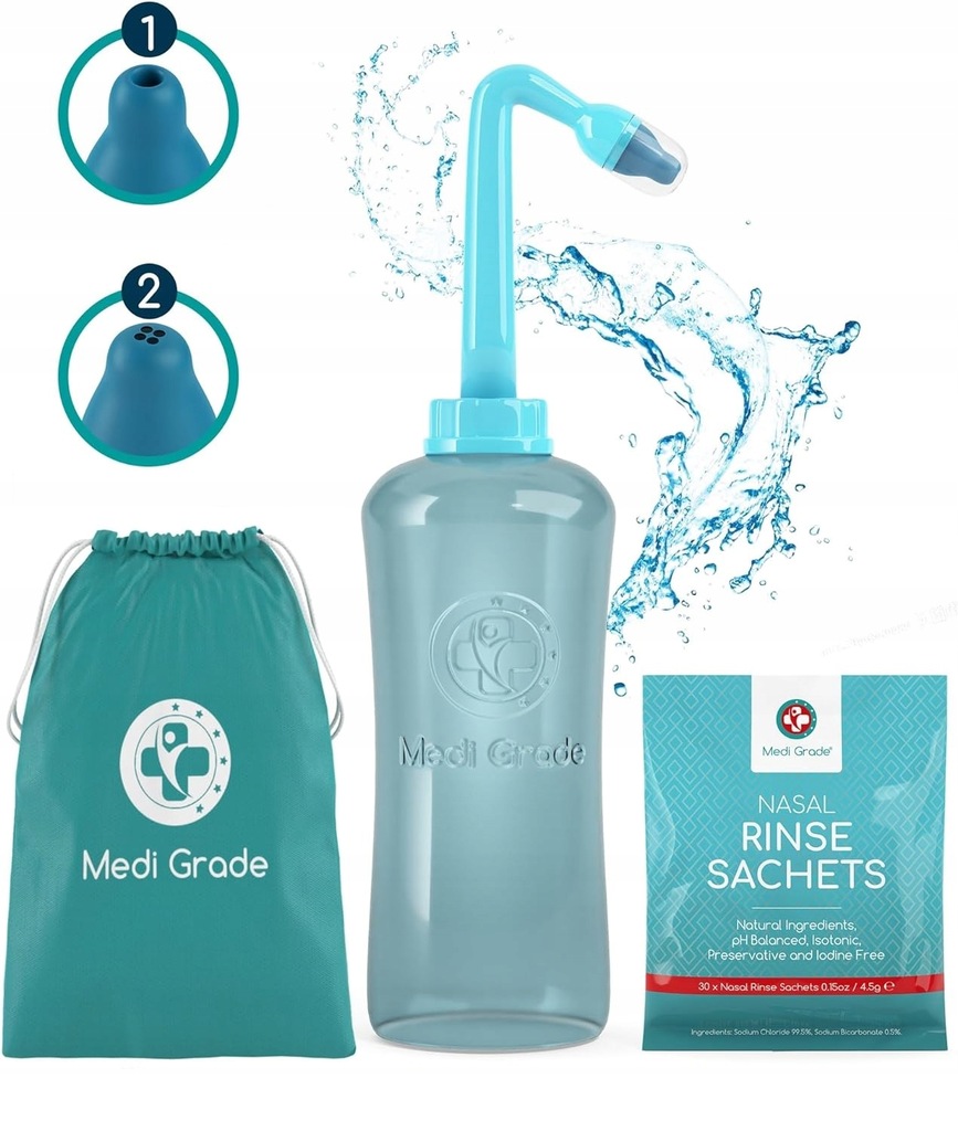 Zestawie zawiera zapas saszetek z roztworem do płukania(30 sztuk), poręczną torbę do przechowywania ze ściągaczem oraz dwie końcówki do irygacji umożliwiające dostosowywanie przepływu do indywidualnych preferencji. Oznacza to, że zawsze możesz mieć przy sobie wszystko czego potrzebujesz dla dokładnego i odświeżającego oczyszczania nosa.