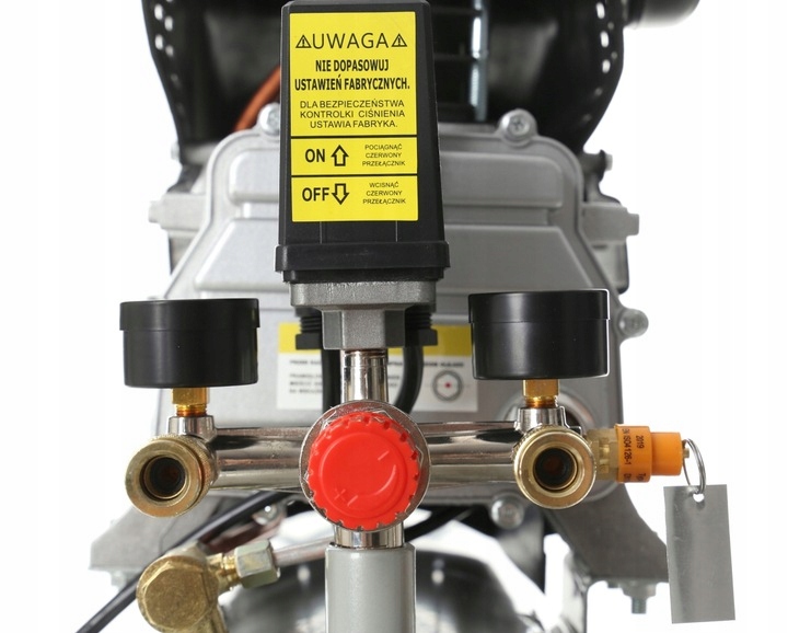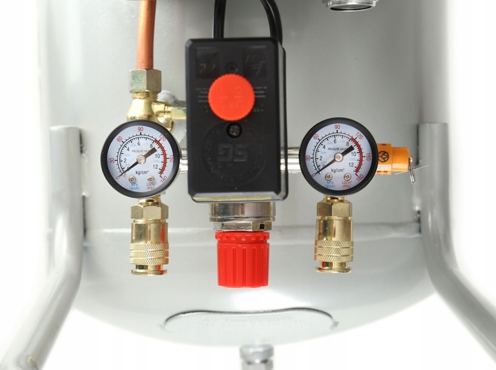 - Ergonomiczny - posiada reduktor ciśnienia wyposażony w innowacyjny mechanizm regulacji, 2 duże manometry usytuowane na kompresorze w pozycji ułatwiającej odczyt parametrów oraz wygodny w eksploatacji kranik spustowy.