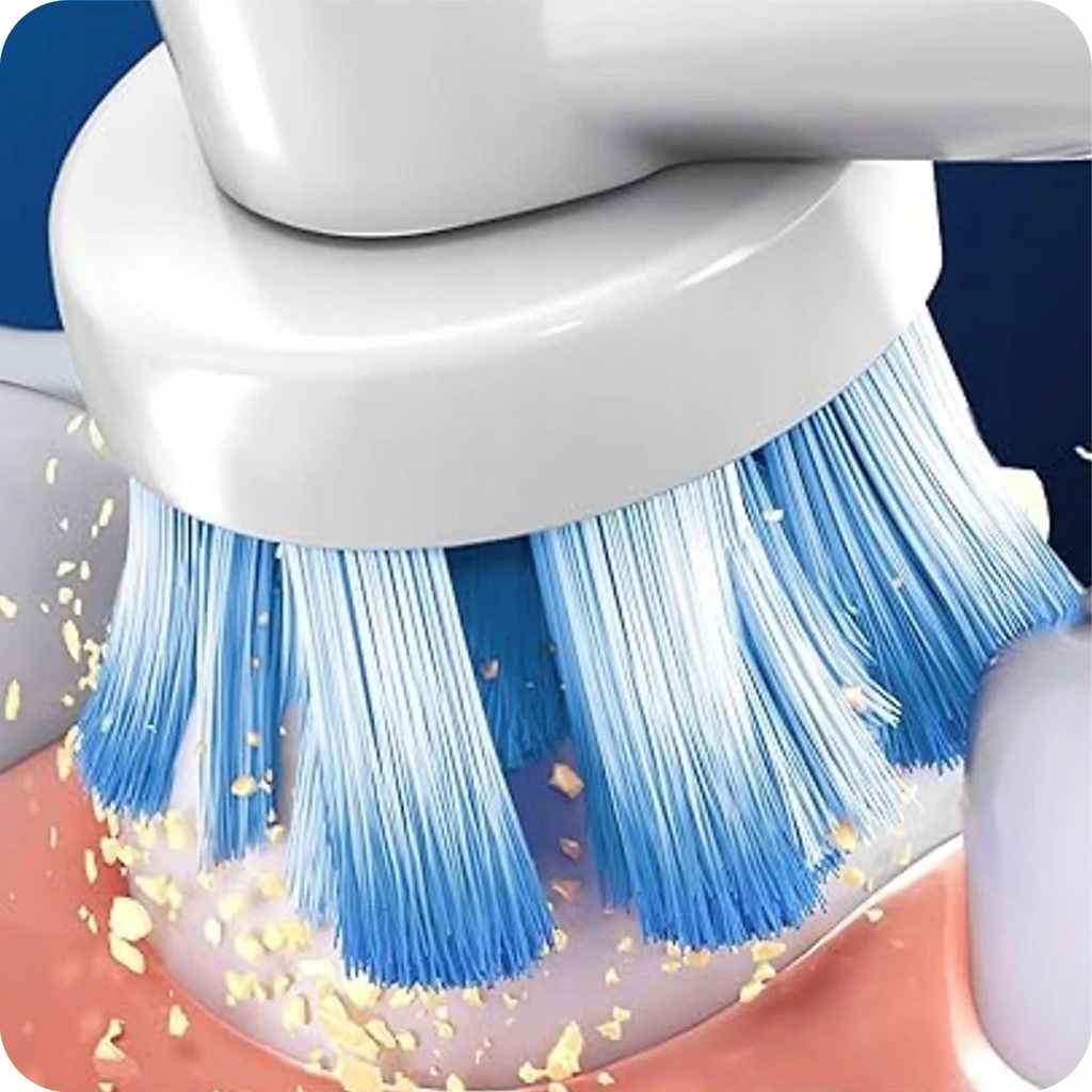 ⭐Wybór odpowiedniej końcówki do szczoteczki jest równie ważny jak sama szczoteczka do zębów. Końcówka wymienna Oral-B pozwala cieszyć się zdrowymi dziąsłami i uczuciem świeżości jamy ustnej. Zaawansowany system włókien końcówki usuwa więcej płytki nazębnej i czyści dokładniej, niż zwykła klasyczna manualna szczoteczka. Główka o kształcie otaczającym cały ząb została zaprojektowana w taki sposób, aby skutecznie oraz bezpiecznie usuwać osad przy linii dziąseł.