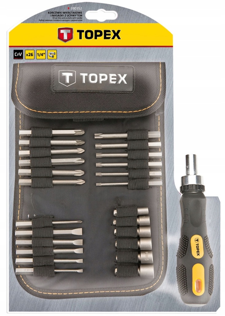 Końcówki wkrętakowe i nasadki z uchwytem, zestaw 26 szt., 1/4", uchwyt wkętakowy magnetyczny, 6 szt. nasadek wkrętakowych, rozmiary: 5, 6, 7, 8, 9, 10 mm, 18 szt. końcówek wkrętakowych, rozmiary; płaskie: 3, 4, 5, 6, 7 mm, krzyżowe PH0, PH1, PH2, PH3, PZ1, PZ2, PZ3, Torx: T10, T15, T20, T25, T27, T30, stal CrV, tekstylne etui
