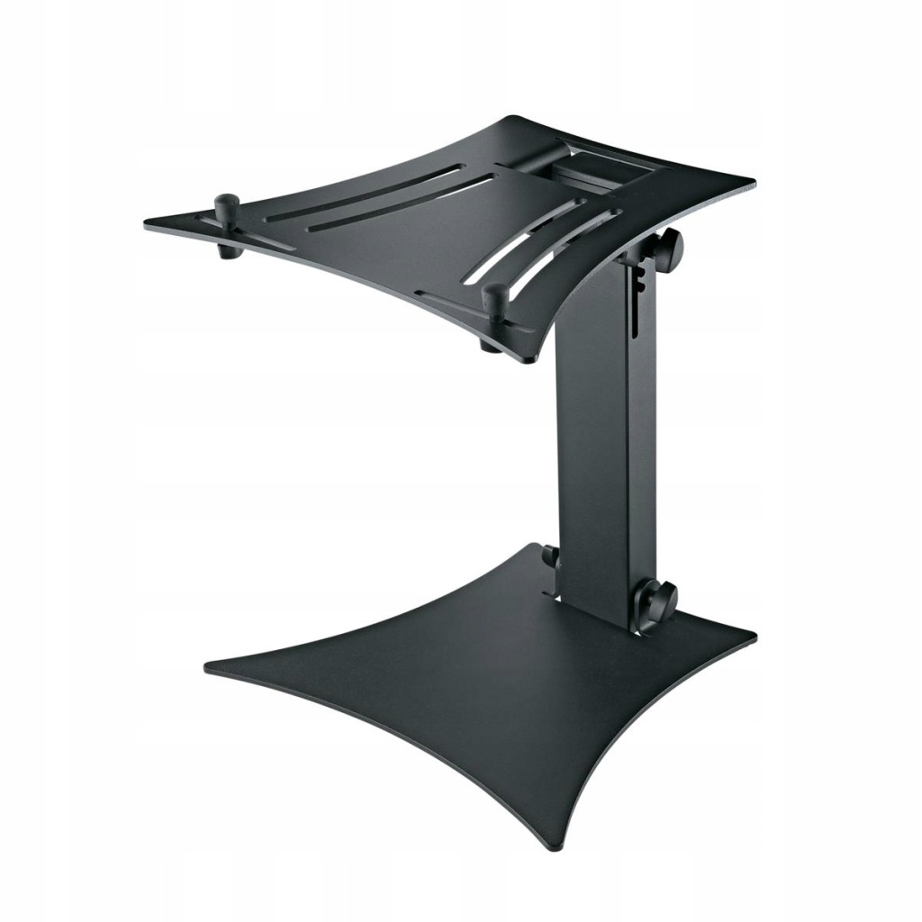 Atrakcyjny stojak do monitorów studyjnych i głośników. Regulacja wysokości wynosi od 167 do 254 mm. 4 gumowe podkładki na podłogę i tacę zapewniają stabilność i filtrację hałasu. Zalecane maks. obciążenie wynosi 15 kg. Wymiary obszaru nośnego (tacy) wynoszą 150 x 170 mm.