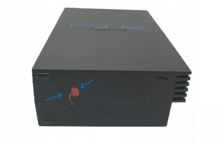 Stan wizualny: w naszej ocenie całość jest w stanie dobrym - konsola nosi ślady użytkowania w postaci rysek na obudowie (nie ma ich dużo, nie udało się ich uchwycić na zdjęciach - normalne ślady użytkowania dla tego typu urządzeń). Po lewej stronie jest przybrudzenie (farbą? - zaznaczone na zdjęciu), prawdopodobnie da się je całkowicie usunąć.