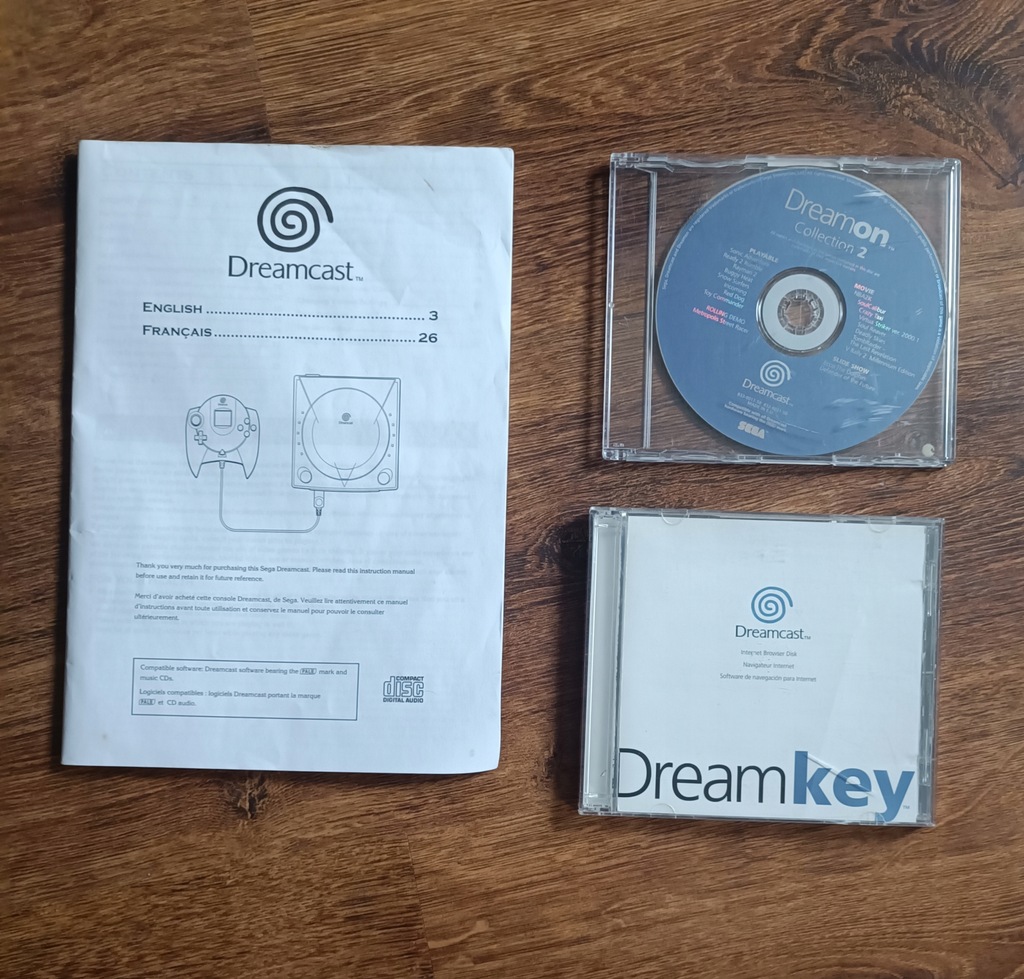 Konsola, pudełko, pad, okablowanie, dwie oryginalne gry, instrukcja, płyta Dreamkey, wytłoczka na konsole.