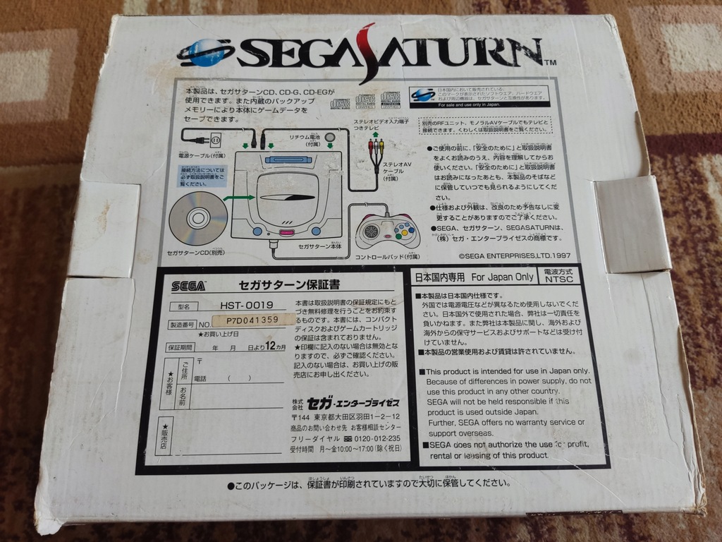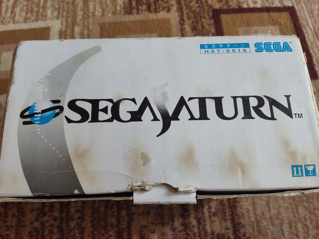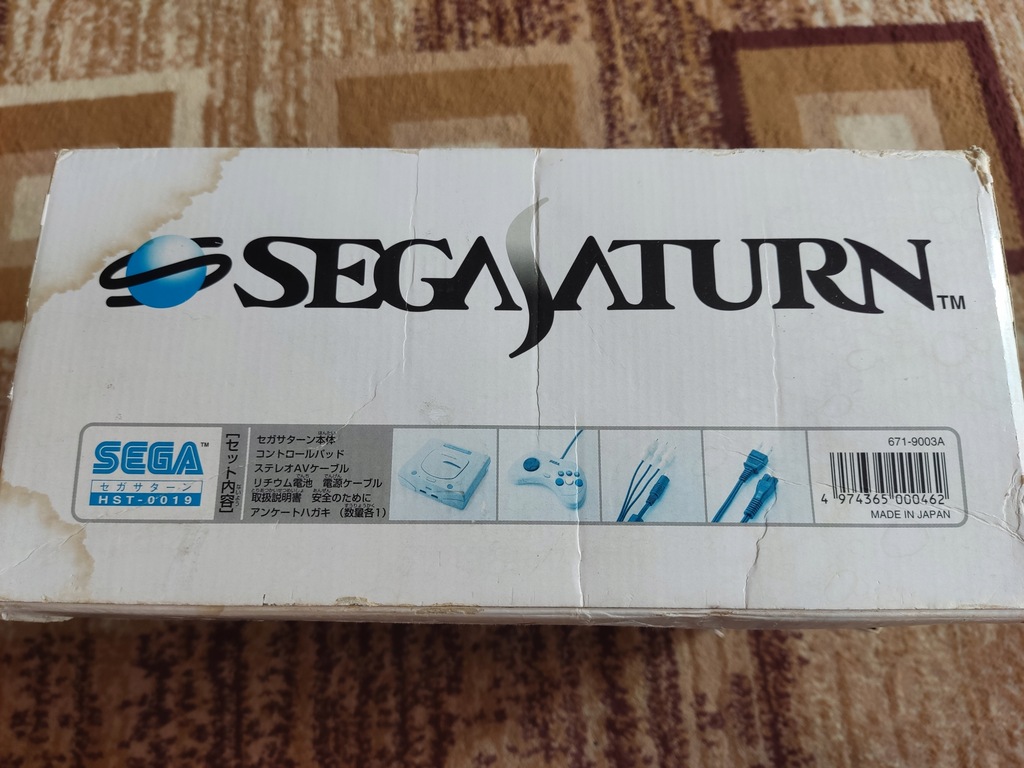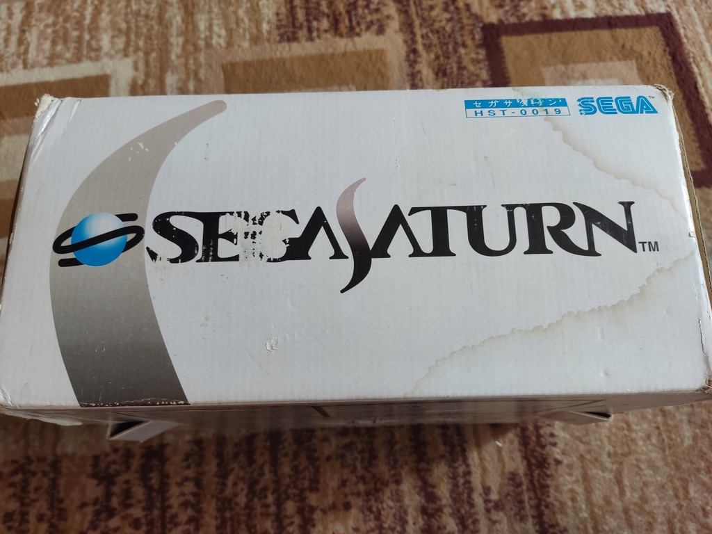 Konsola Sega Saturn wraz z pudełkiem oraz kontrolerem.