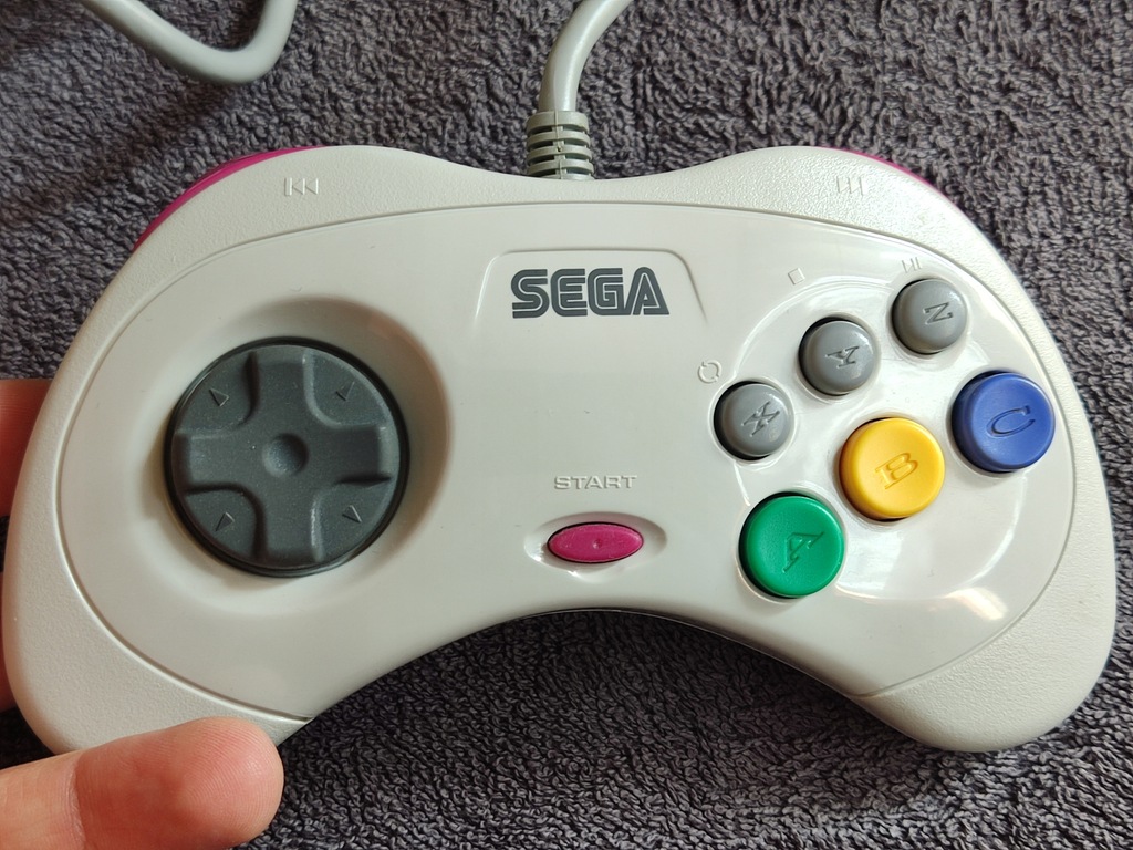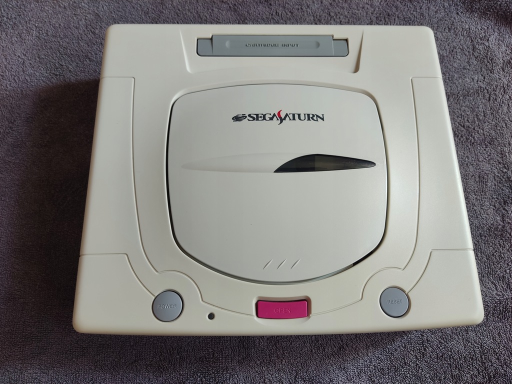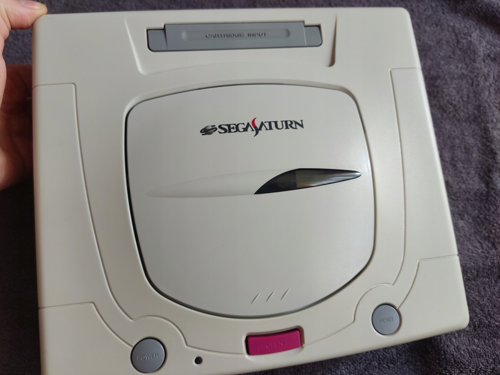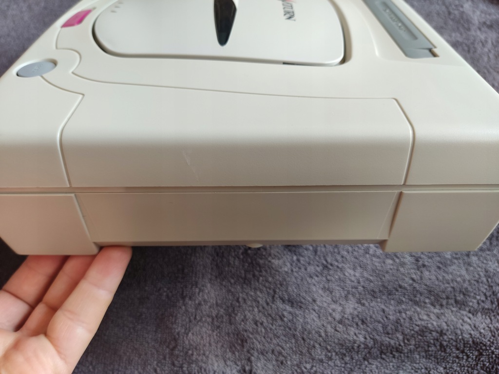 Konsola Sega Saturn wraz z pudełkiem oraz kontrolerem.