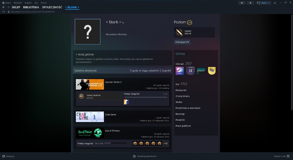- 452 gry w bibliotece, 267 odznak, 130 poziom profilu,
