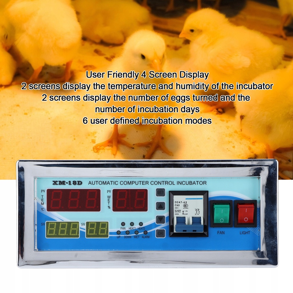 - Liczba sygnałów wyjściowych: 7 (nadmierna temperatura, kontrola temperatury, niewystarczająca temperatura, skręt jajka w lewo, obrót jajka w prawo, kontrola wilgotności, alarm)