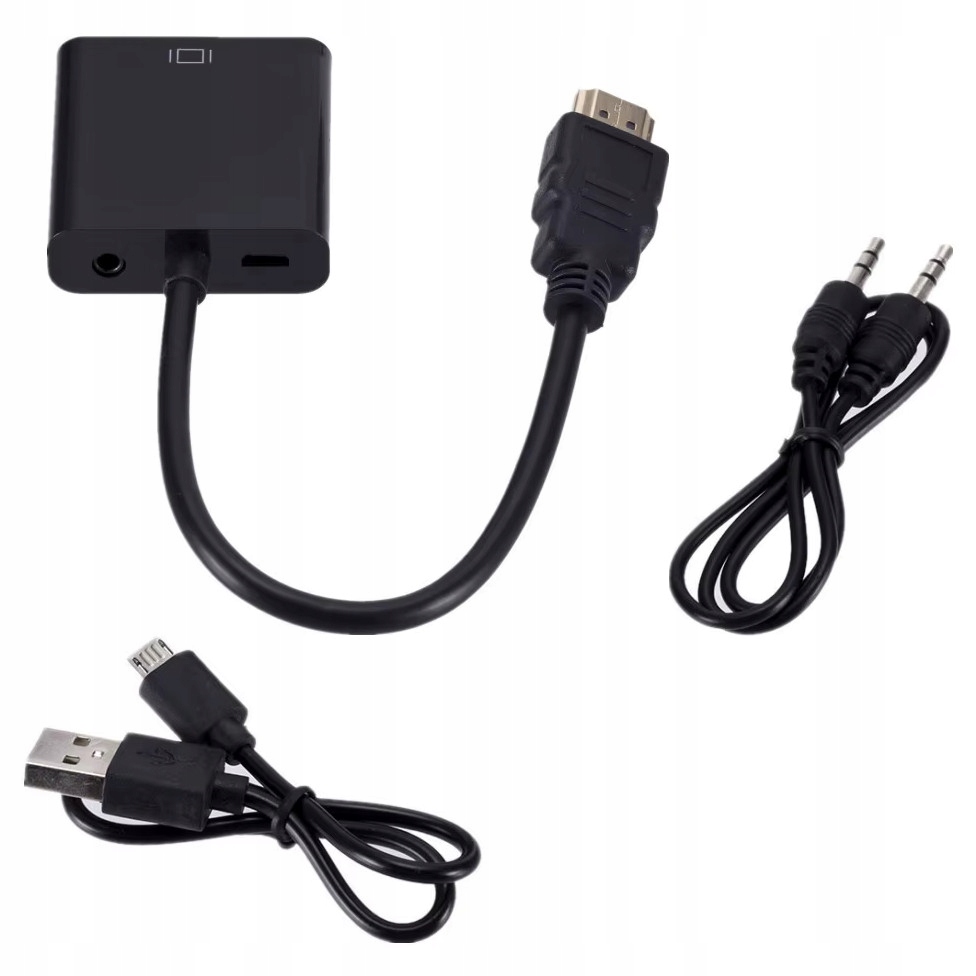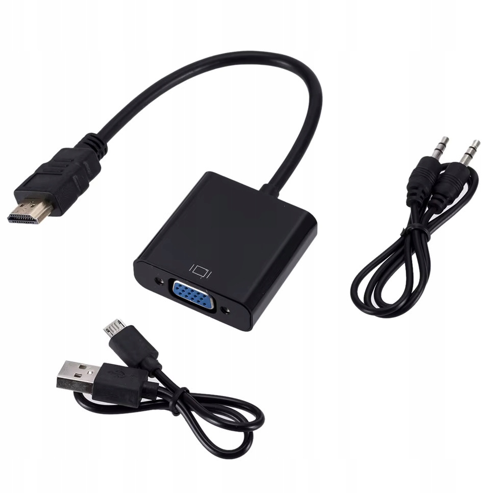 Adapter konwertuje cyfrowy sygnał HDMI do sygnału analogowego VGA (jakość HD) oraz sygnału Audio (wyjście jack stereo 3,5 mm).