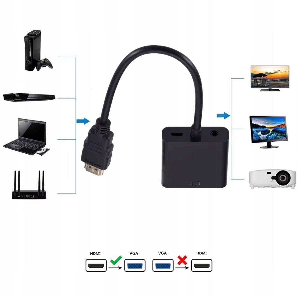 Konwerter HDMI do VGA+audio pozwala na podłączenie monitora lub projektora ze złączem VGA do dowolnego urządzenia wyposażonego w złącze HDMI np. tunera DVB-T, SAT, laptopa, komputera PC, odtwarzacza blu-ray, konsoli, itp.