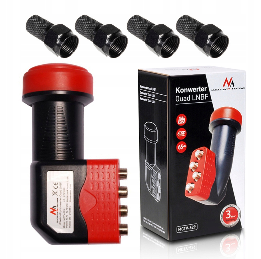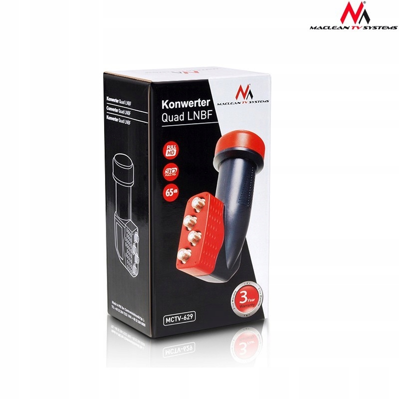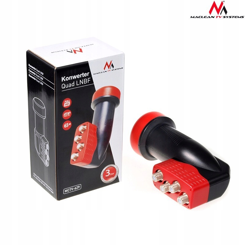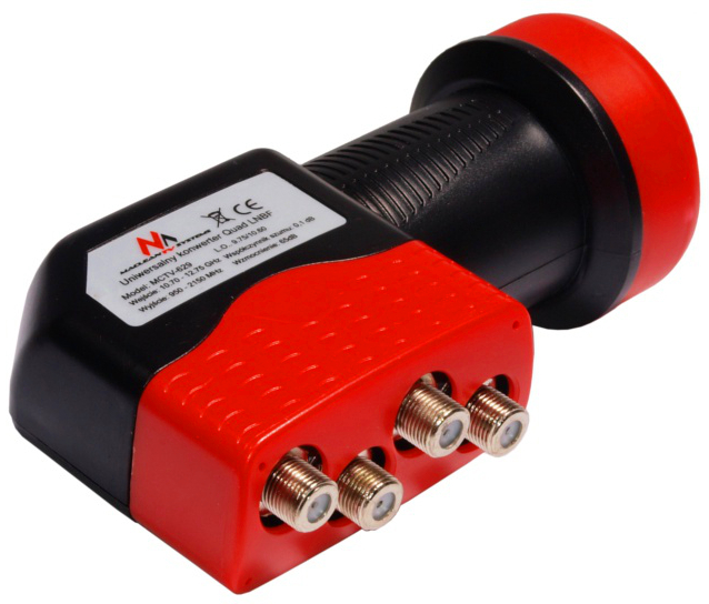 Wysokiej jakości, uniwersalny konwerter satelitarny quad ( LNB ) MCTV-629 o wsp. szumów 0,1dB. Umożliwia podłączenie czterech odbiorników satelitarnych lub dwóch odbiorników SAT z nagrywarką i dwoma niezależnymi głowicami (wejściami LNB) np.: dekoder telewizji n, n-box recorder.