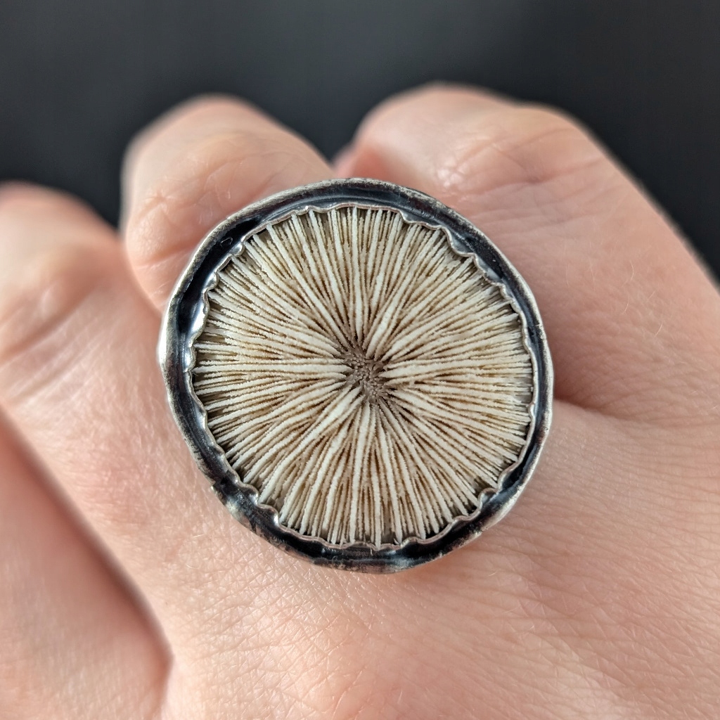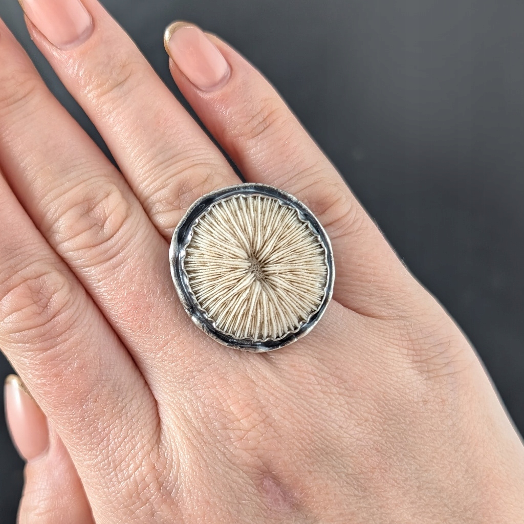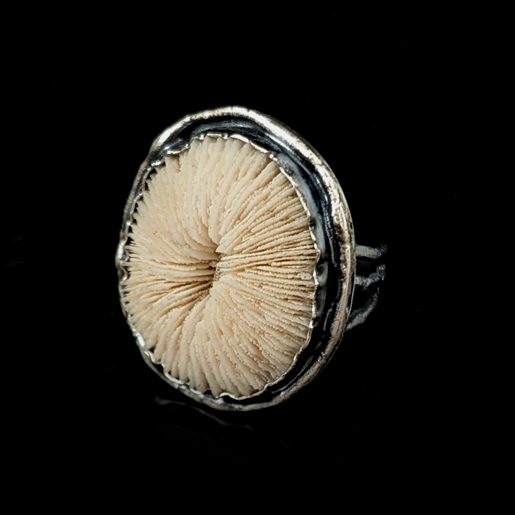 Pierścień z oprawionym własnoręcznie w srebro próby 925 pięknie wykształconym skamieniałym koralem grzybowym, zwanym też grzybowieńcem. Zjawiskowy okaz podkreślony jest oksydowanym srebrem. Wymiary oprawy koralu to 31 x 29 mm .Waga 12 g. Rozmiar jubilerski 14 szeroką na 12 mm obrączkę mogę powiększyć na max 15. Pierścień zapakowany w ozdobne pudełeczko.