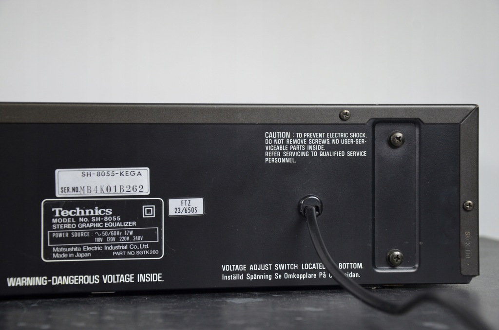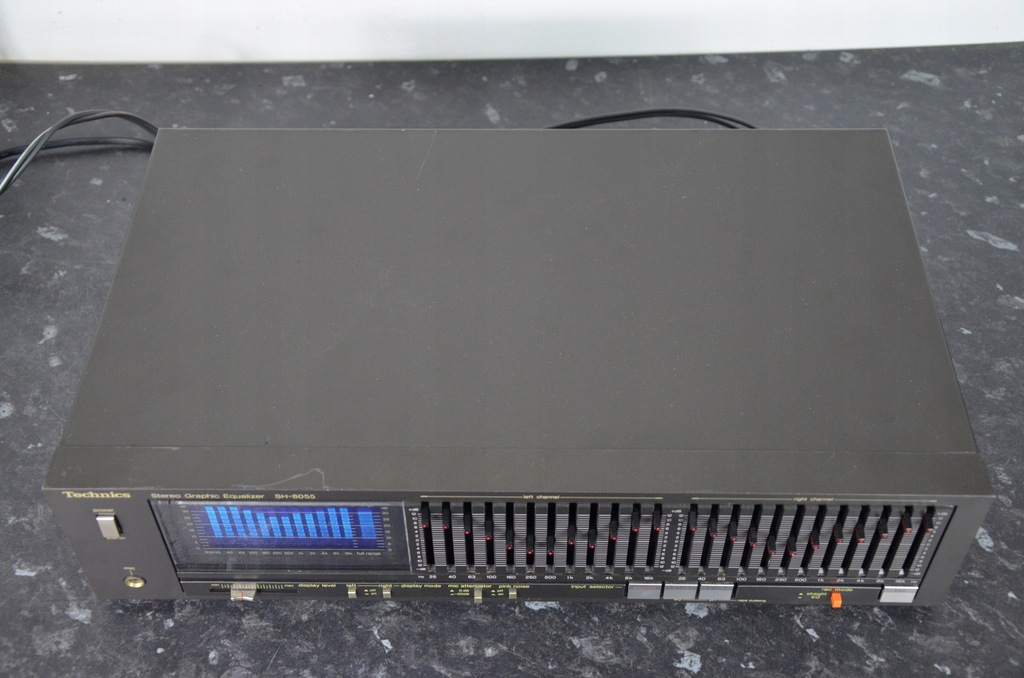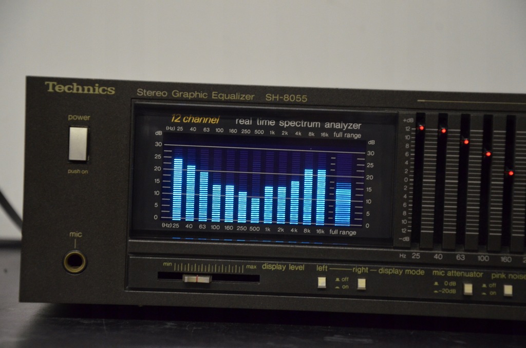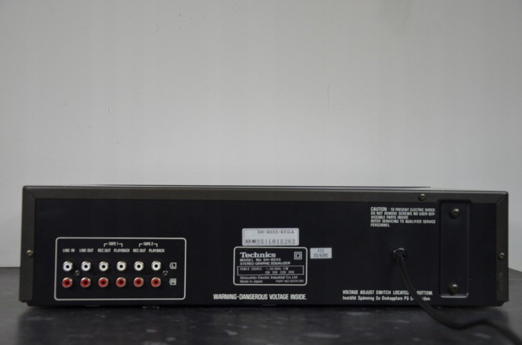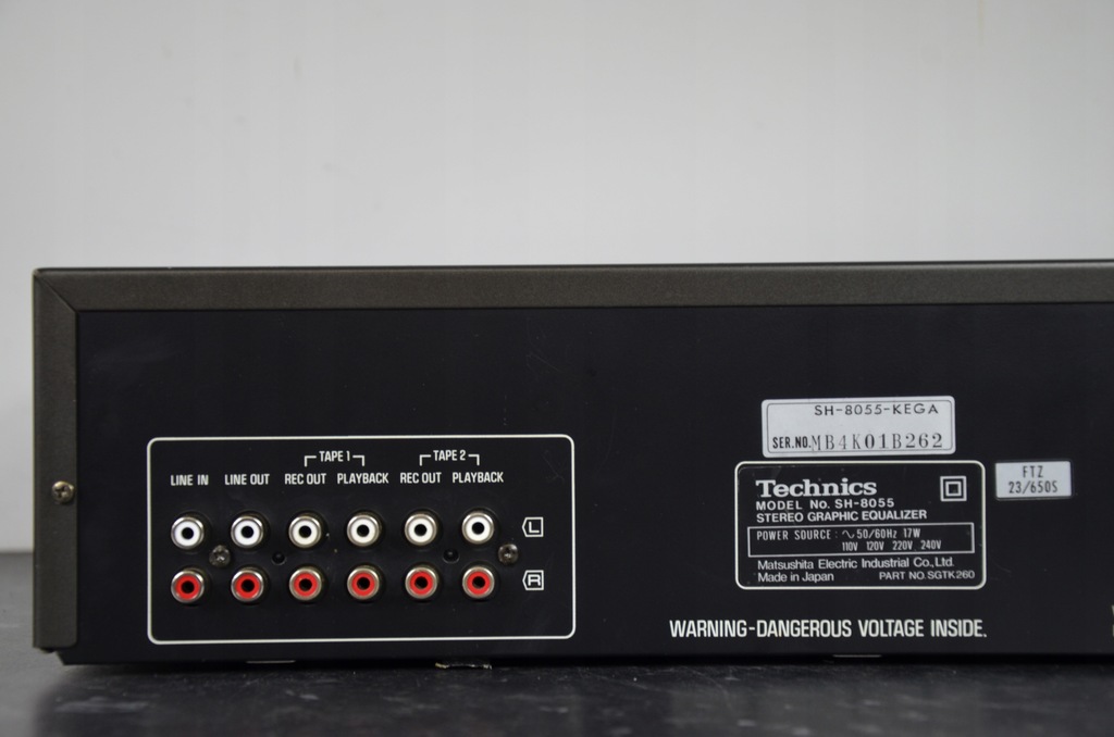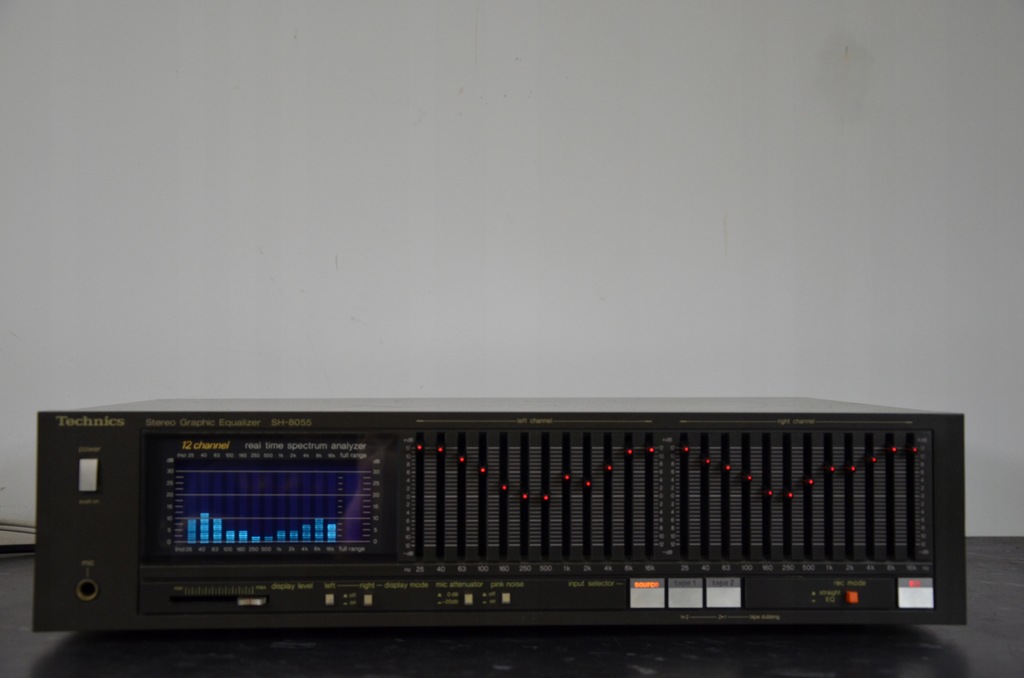 Technics Model: SH-8055 Typ: Korektor Lata budowy: 1983 - 1989 Kolory: srebrny, czarny Pobór mocy: 17W Wymiary (szer. x wys. x gł.): 430 x 108 x 272 mm Waga: 4,1 kg Nowa cena ok.: 900 DM znajomości Liczba wejść: Maksymalne napięcie wejściowe: 8 V~ Impedancja wejściowa: 47 kOhm Czułość mikrofonu: ponad -74 dBV/µ bar Tłumienie mikrofonu: -20 decybeli Złącze mikrofonu (dla analizatora widma w czasie rzeczywistym) Stereo Line IN i Line OUT (od i do wzmacniacza) Taśma stereofoniczna 1 Nagrywaj i odtwarzaj Taśma stereofoniczna 2 Nagrywaj i odtwarzaj Liczba wyjść: Zakreślać: Dane techniczne Pasmo przenoszenia: 5 Hz do 100 kHz Maksymalne napięcie wyjściowe: 8 V~ Znamionowe napięcie wyjściowe: 1 V~ Znamionowe THD: 0,002% przy 1 kHz, 0,003% od 20 Hz do 20 kHz Współczynnik szumu: 102 dB, 110 dB IHF A Separacja kanałów: 70 dB Kontrola odpowiedzi częstotliwościowej: +12 dB do -12 dB Częstotliwości środkowe: 25 Hz, 40 Hz, 63 Hz, 100 Hz, 160 Hz, 250 Hz, 500 Hz, 1 kHz, 2 kHz, 4 kHz, 8 kHz, 16 kHz Różowy szum: 50 mV Kontrola poziomu wyświetlania Przełącznik wyświetlacza dla lewego i/lub prawego kanału Przełącznik tłumienia mikrofonu Różowy przełącznik szumów 3 przełączniki wyboru wejść podświetlane od wewnątrz Tryb nagrywania prosty/EQ EQ aktywny/deaktywny podświetlany od wewnątrz 12 regulatorów częstotliwości dla lewego i prawego kanału, podświetlonych czerwoną diodą LED Specjalny sprzęt Złącze z przodu dla mikrofonu kalibracyjnego (gniazdo 6,3)