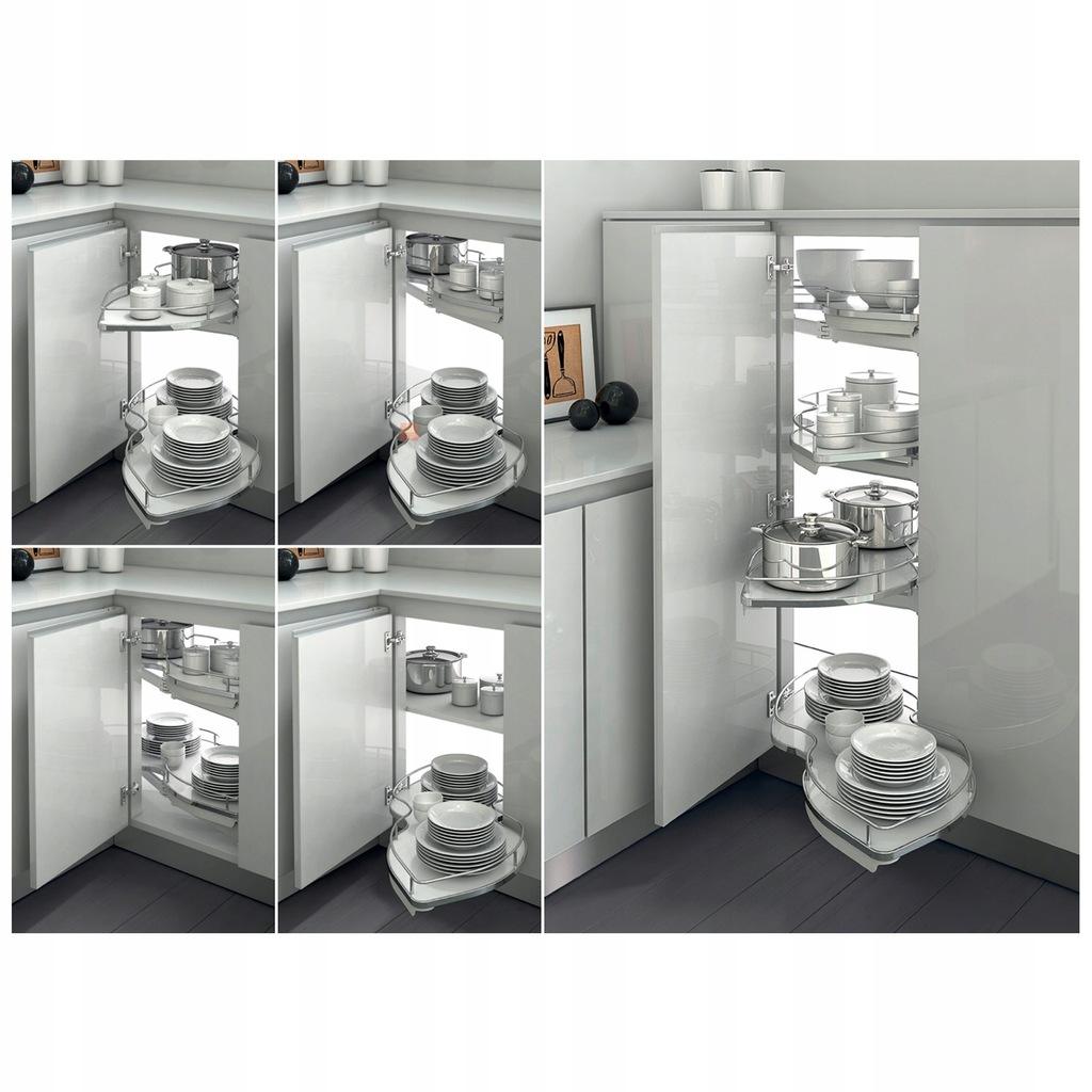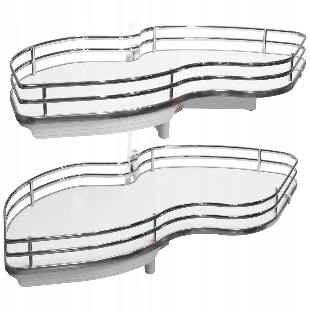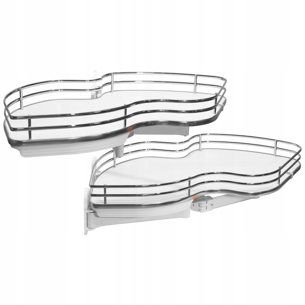 Cechy produktu: System funkcjonalnego zagospodarowania przestrzeni szafek narożnych dolnych, Półki wysuwają się niezależnie od siebie ułatwiając dostęp do produktów, Płynny bezszelestny wysuw, Bardzo stabilne, 100% wysuwu, niezależne mocowanie każdej z półek, płyta perforowana, szybki montaż (szablon montażowy w komplecie), Maksymalne obciążenie na jedną półkę - 20kg