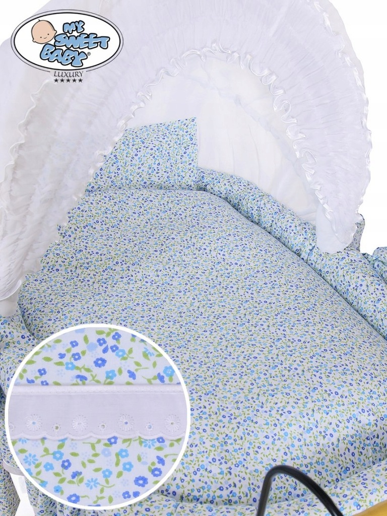Kosz Mojżesza Retro Jasmine - Naturalny + niebiesko-biała pościel z białą koronką