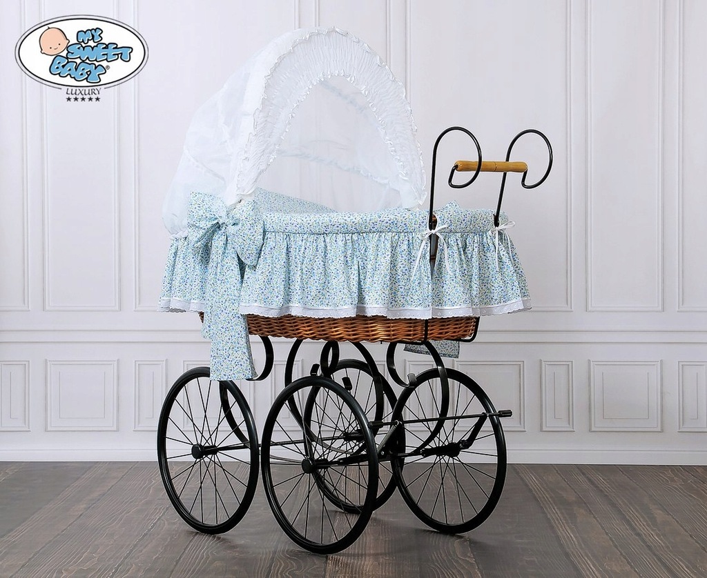Wiklinowy kosz niemowlęcy renomowanej marki MY-SWEET-BABY Luxury,z oryginalnym metalowym ręcznie wyginanym podwoziem w stylu retro. Charakter podkreślają duże koła szprychowe oraz stylizowana ręcznie wyginana metalowa rączka z drewnianym uchwytem. Kosz jest ręcznie wypleciony, z ażurową wstawką. Brzegi kosza wykończone plecionym warkoczem. Ruchoma tekstylna budka na metalowym białym stelażu. Obszycie na kosz z 100% bawełny, trzywarstwowe, z dodatkową warstwą miękkiej sprężystej włókniny dla wytłumienia kosza i zapewnienia delikatności dziecku.