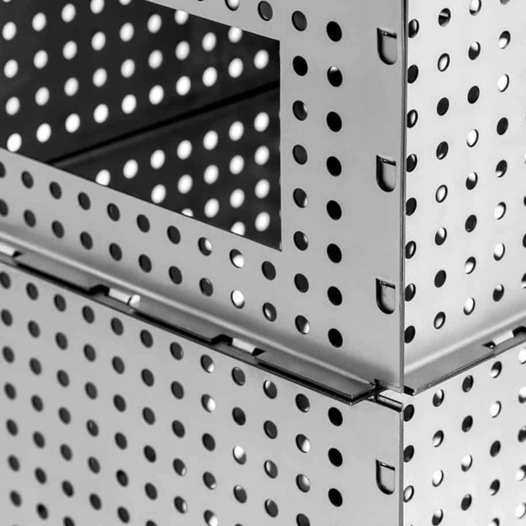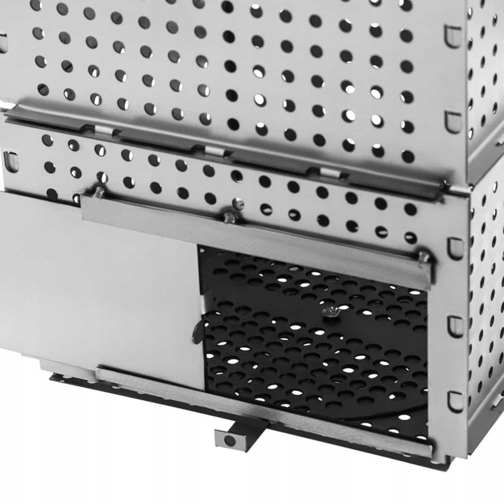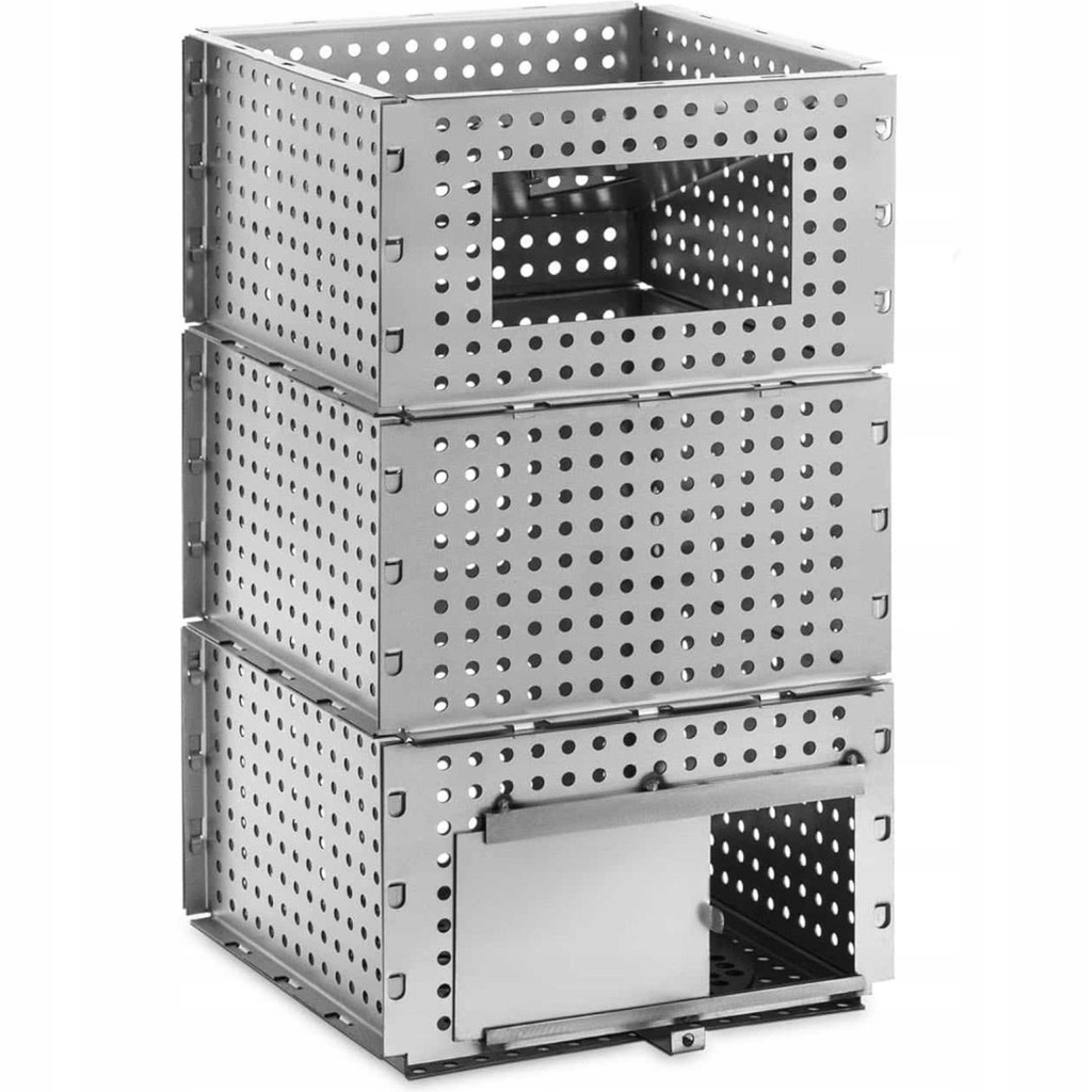 Kosz na pellet marki Uniprodo składa się z trzech poziomów, których poszczególne elementy łączy się ze sobą. Konstrukcję umieszcza się w kominku, gdzie posłuży jako pojemnik na pellet. W górnym poziomie zastosowano szyb napełniający, do wsypywania granulatu. W komplecie znajduje się poręczna szufelka. W pokrywie kosza znajdują się otwory wentylacyjne, które można ustawić w zależności od potrzeb. Dolny poziom posiada zamykany otwór do wygodnego wyjmowania popiołu. Konstrukcję kosza wykonano ze stali węglowej o grubości 1,5 mm. Kosz do pelletu przeznaczony jest do pracy do 1500°C.