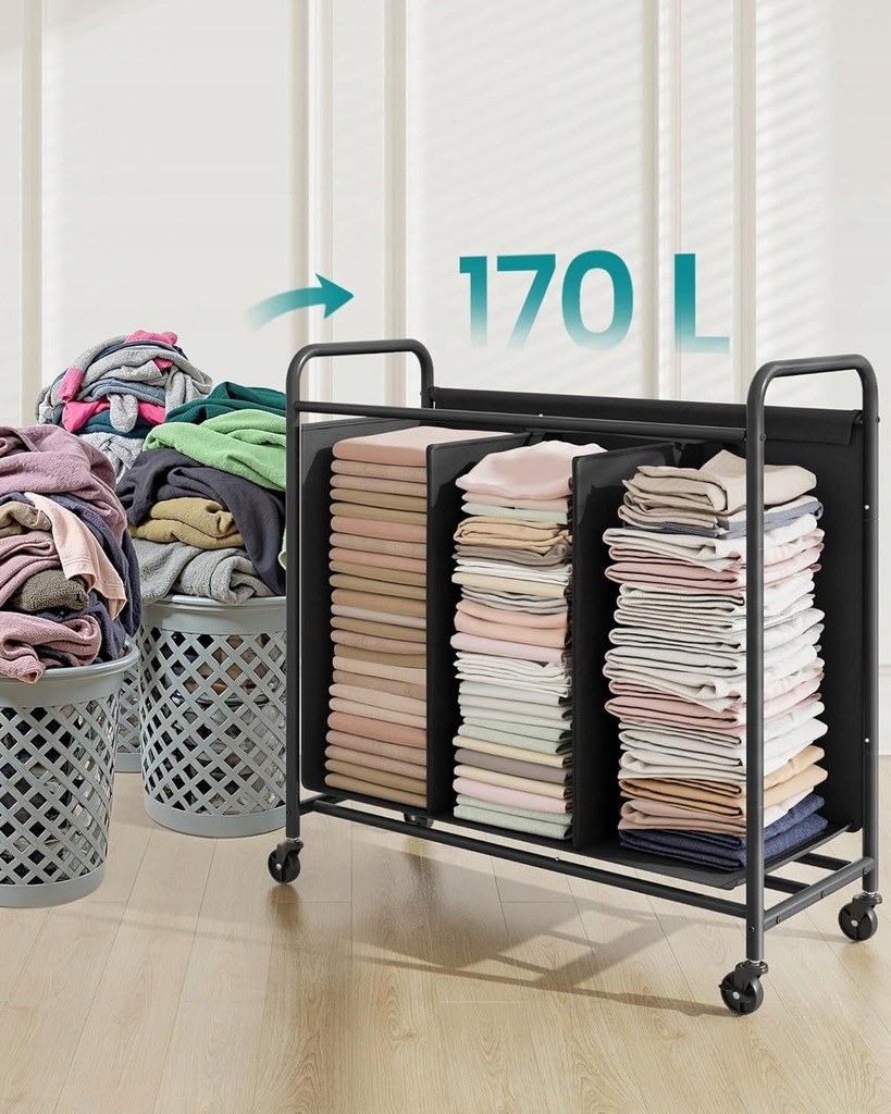 DUŻA POJEMNOŚĆ 170 L Ten kosz na pranie z 3 przegrodami mieści łącznie 170 litrów, dzięki czemu wszystkie domowe pranie można przechowywać w jednym miejscu, a stosy prania nie będą rozrzucone po podłodze