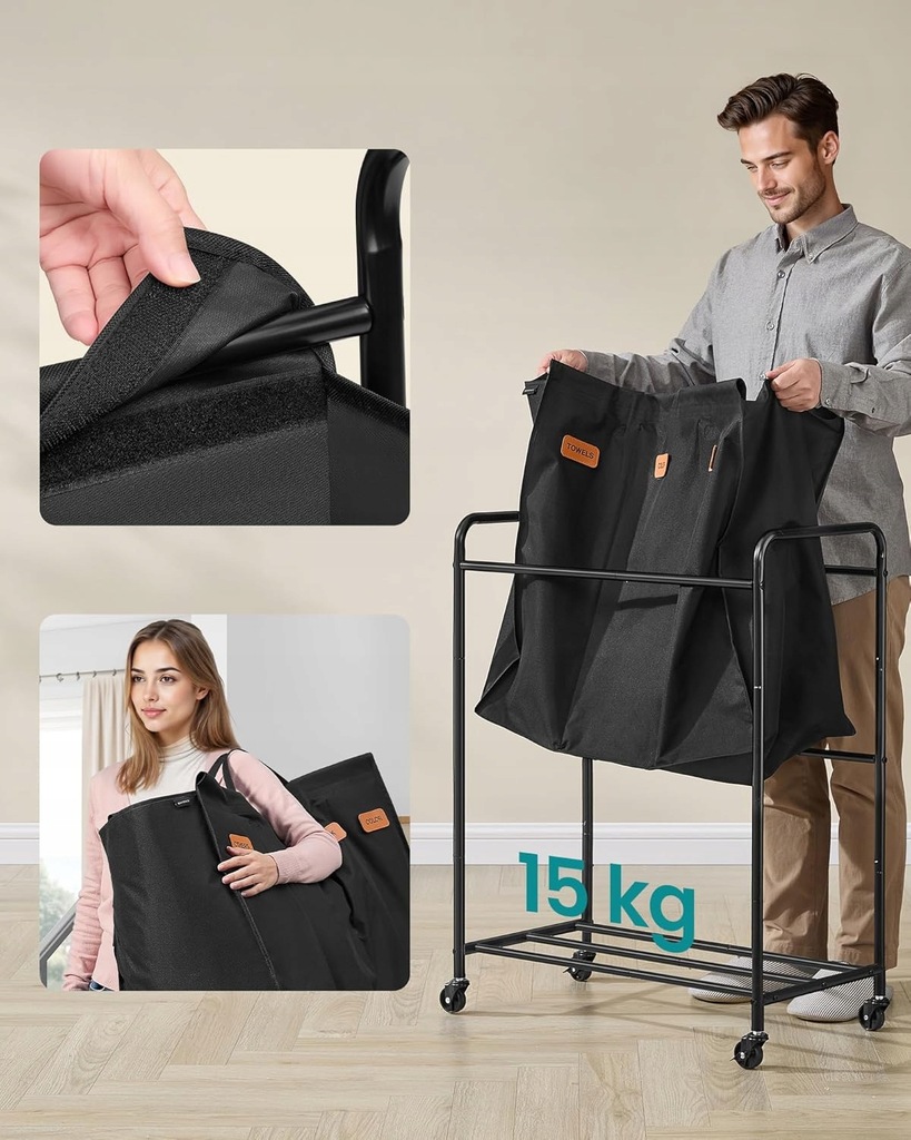 SOLIDNY I TRWAŁY Wzmocniona i trwała tkanina Oxford 600D, wsparta na solidnych stalowych rurkach o średnicy 19 mm, tworzy mocny, stabilny i trwały kosz na pranie, który może pomieścić do 15 kg łącznie