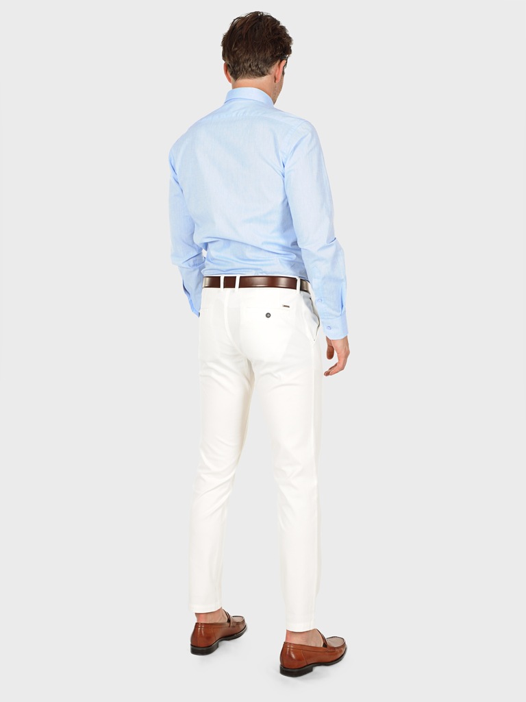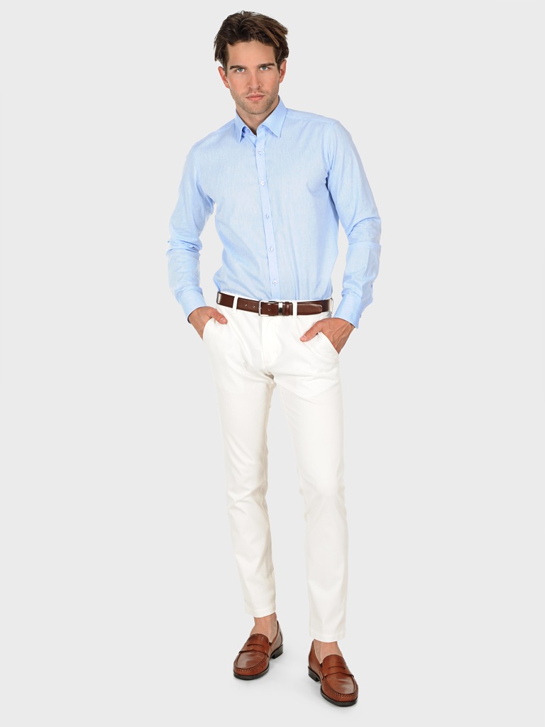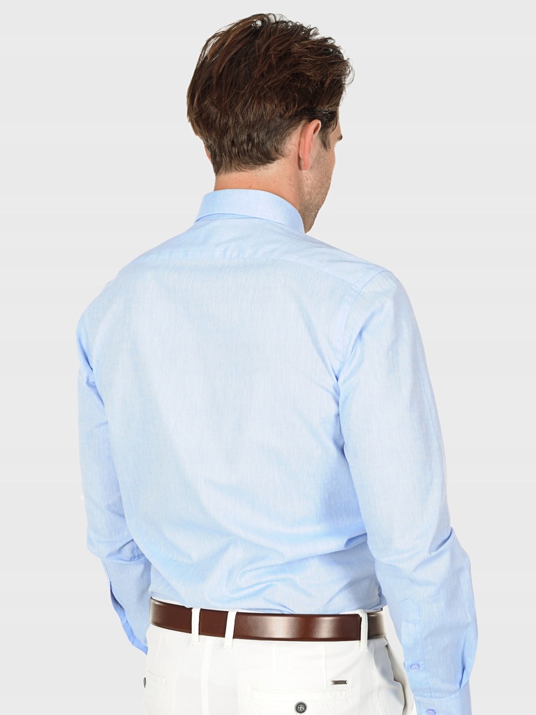 Błękitna koszula męska z dodatkiem lnu James. Obecna w składzie mieszanka lnu sprawia, że koszula jest wyjątkowo przewiewna i doskonale odprowadza ciepło, zapewniając komfort noszenia nawet w najbardziej upalne dni. Koszula posiada podpinany kołnierz, który gwarantuje idealne jego ułożenie, eliminując możliwość odkształcenia czy odstawania. Wykonana w fasonie Slim, który podkreśla sylwetkę zapewniając schludny i dopasowany wygląd. Wyprodukowana w Polsce koszula cechuje się wysoką jakością wykonania i dbałością o każdy detal.