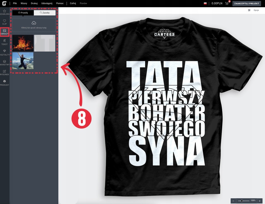 (8) 8️⃣ Przycisk "Obrazy" dzięki któremu tutaj właśnie wgrasz dowolny plik z Twojego komputera, zdjęcie, grafikę. Akceptowalne pliki to (.jpg, .png) - pliki są wykorzystywane tylko do druku następnie są automatycznie usuwane po okresie 30 dni. Zawsze masz możliwość zapisania plików u siebie na komputerze jeżeli chcesz wykorzystać projekt w przyszłości.