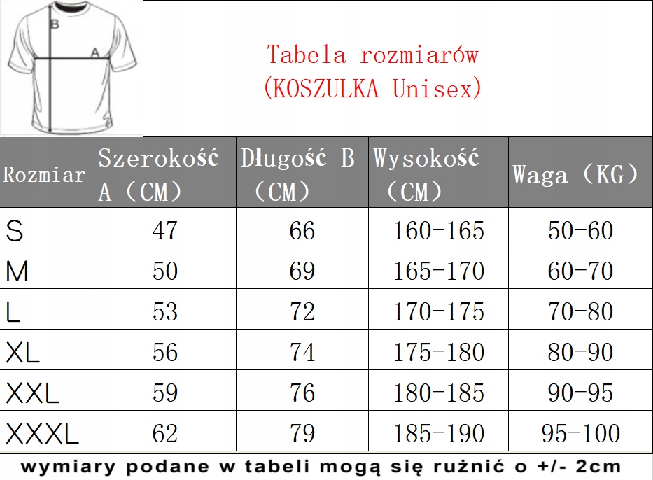 3XL 丨 wysokość 185-190 cm 丨 waga 95-100 kg 丨 Szerokość ubrania 62 cm 丨 Długość 79 cm