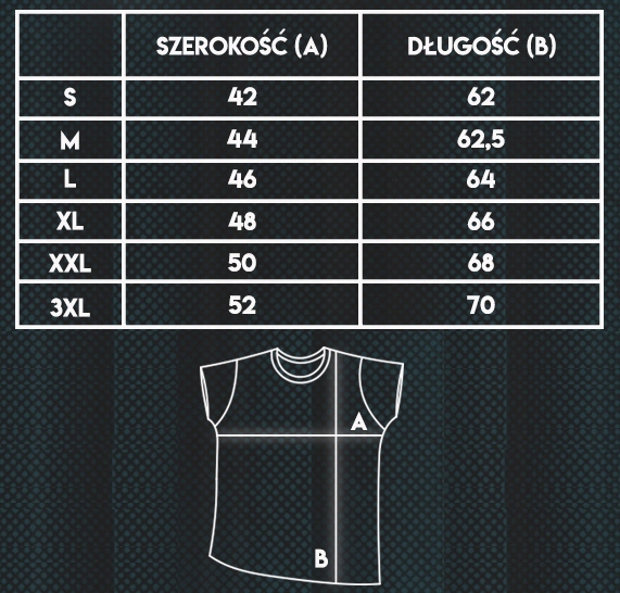 UWAGA! Rozmiarówka może być zaniżona. Aby uniknąć wyboru złego rozmiaru zalecane jest zmierzenie swojej koszulki w domu i dopasowanie odpowiedniego rozmiaru z tabeli rozmiarów. Zalecany wybór większego rozmiaru.