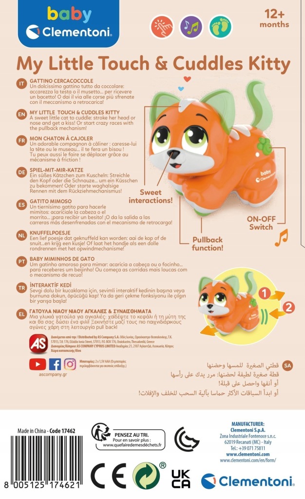Słodki zwierzak z czujnikami na głowie i na pysku, które rozpoznają pieszczoty i wchodzą w interakcje. Liczne melodie i efekty dźwiękowe! Wyjątkowa funkcja pull-back pozwoli zorganizować szalone wyścigi! Reaguje na pieszczoty na głowie i nosie, śpiewając piosenki i rymowanki! Funkcja pull-back wprawia zwierzaka w ruch!