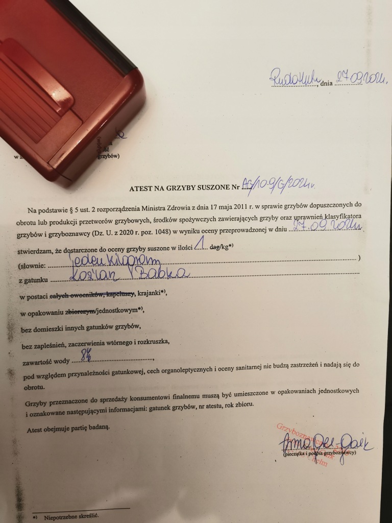 Nad całą moją małą produkcją grzybków czuwa nie tylko Państwowy Powiatowy Inspektorat Sanitarny lecz również grzyboznawca nr 2245