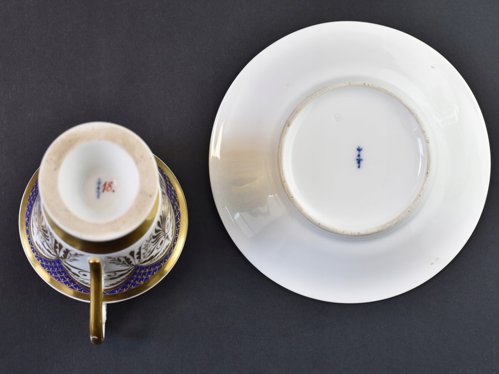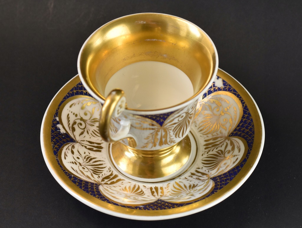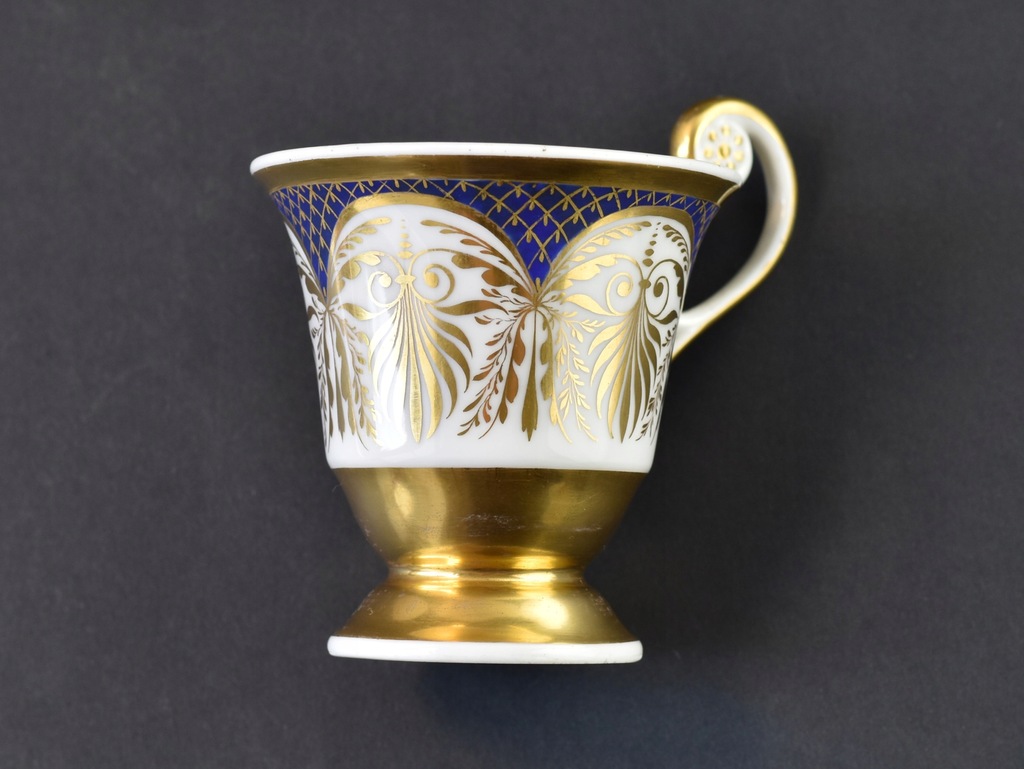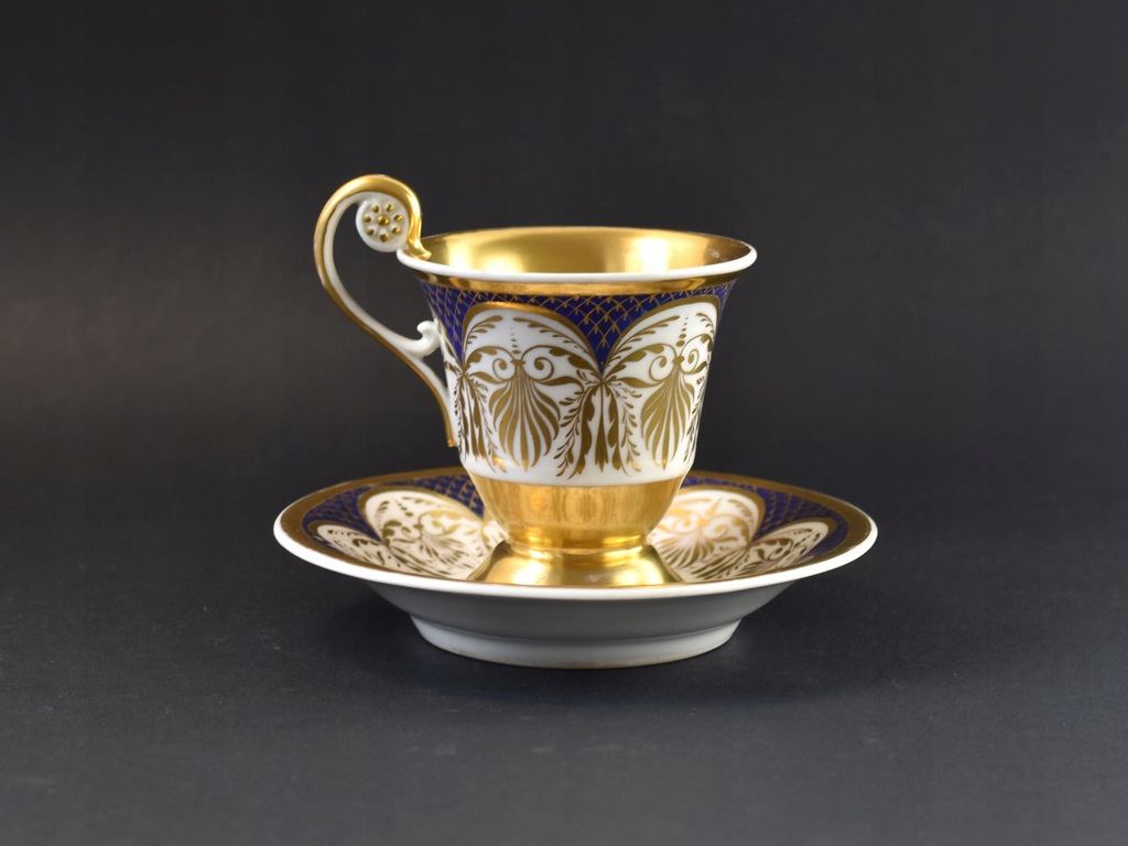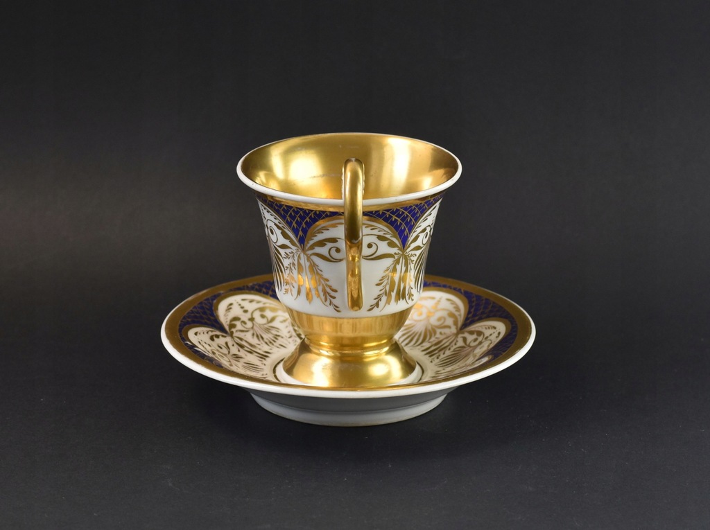 Dekoracyjna filiżanka ze spodkiem ze znanej i cenionej manufaktury KPM Berlin. Bogate, złote ornamenty roślinne oplecione delikatną, złotą siatką umieszczoną na ciemnym tle w kolorze królewskiego niebieskiego.