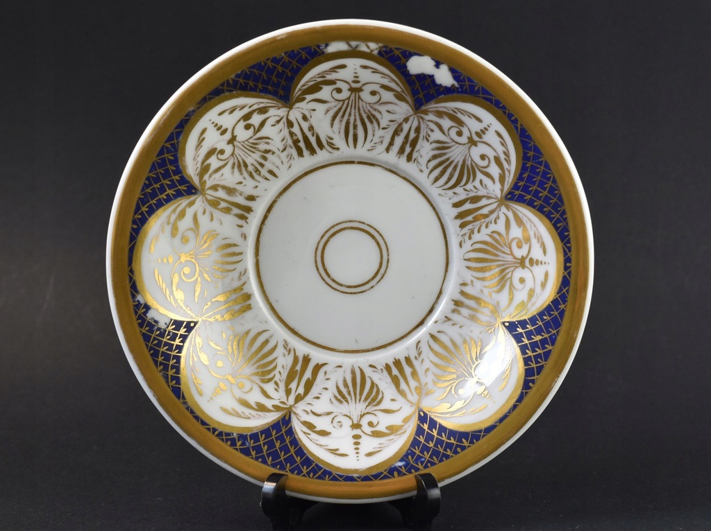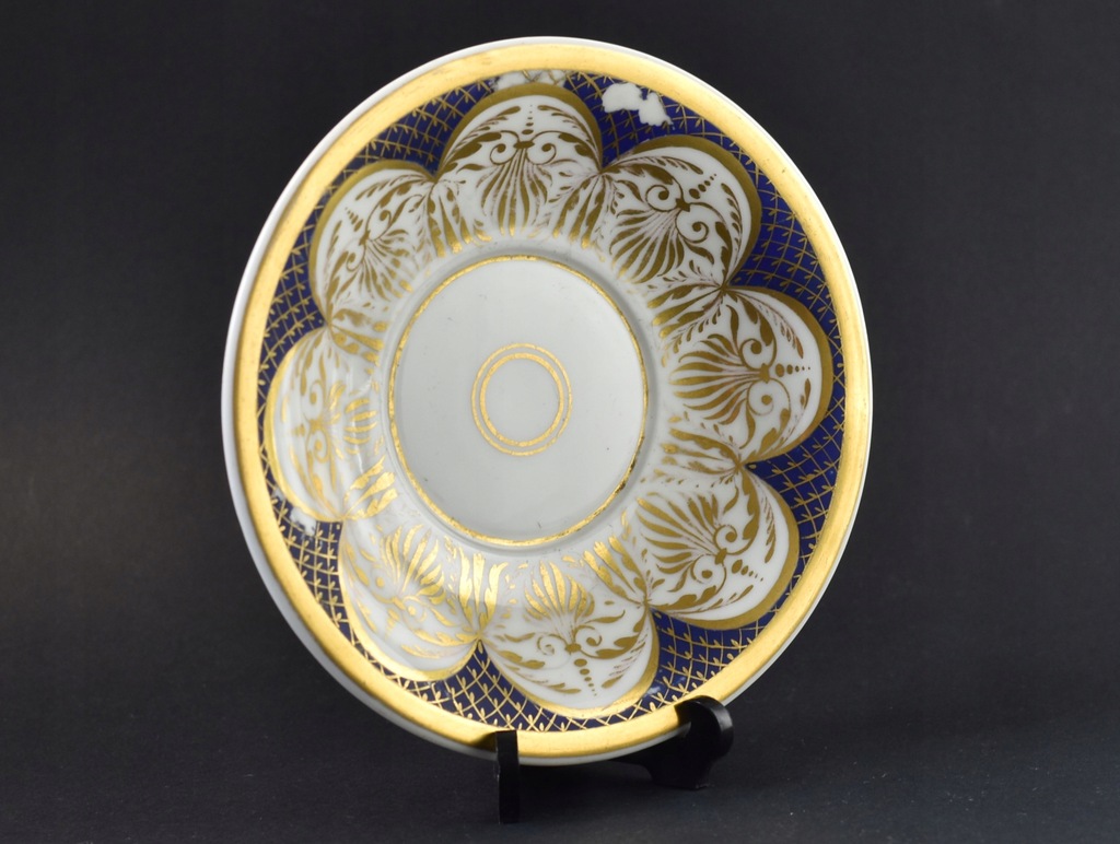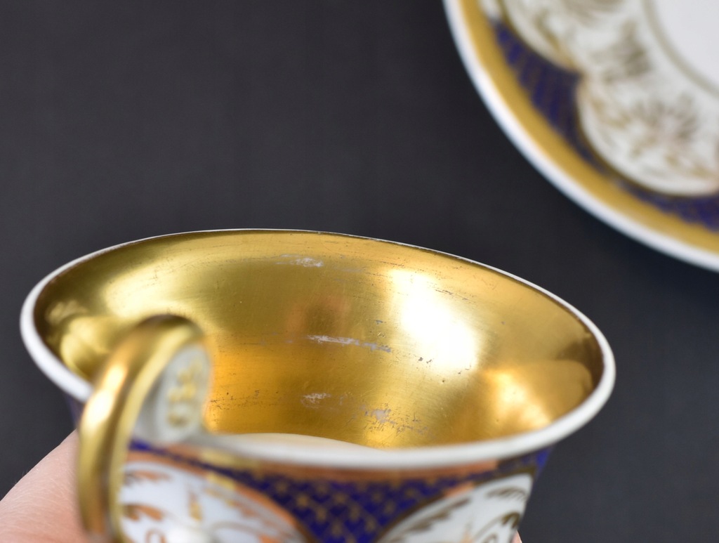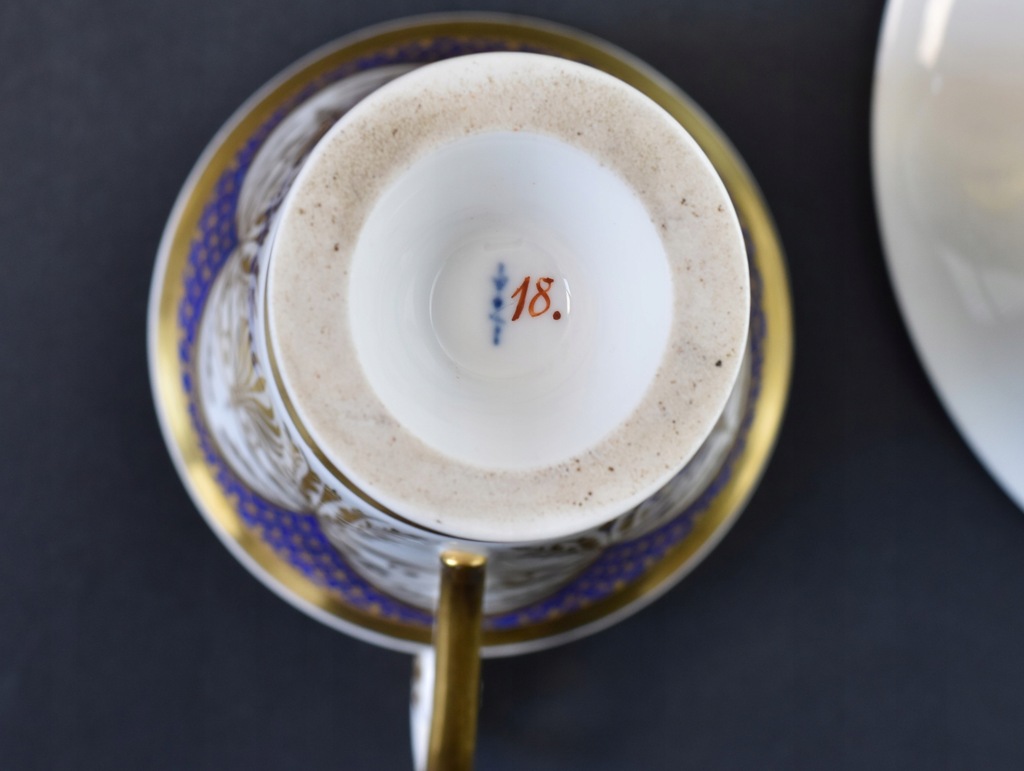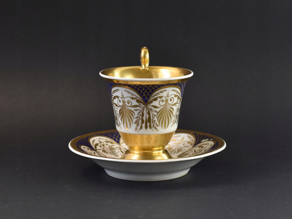 Dekoracyjna filiżanka ze spodkiem ze znanej i cenionej manufaktury KPM Berlin. Bogate, złote ornamenty roślinne oplecione delikatną, złotą siatką umieszczoną na ciemnym tle w kolorze królewskiego niebieskiego.